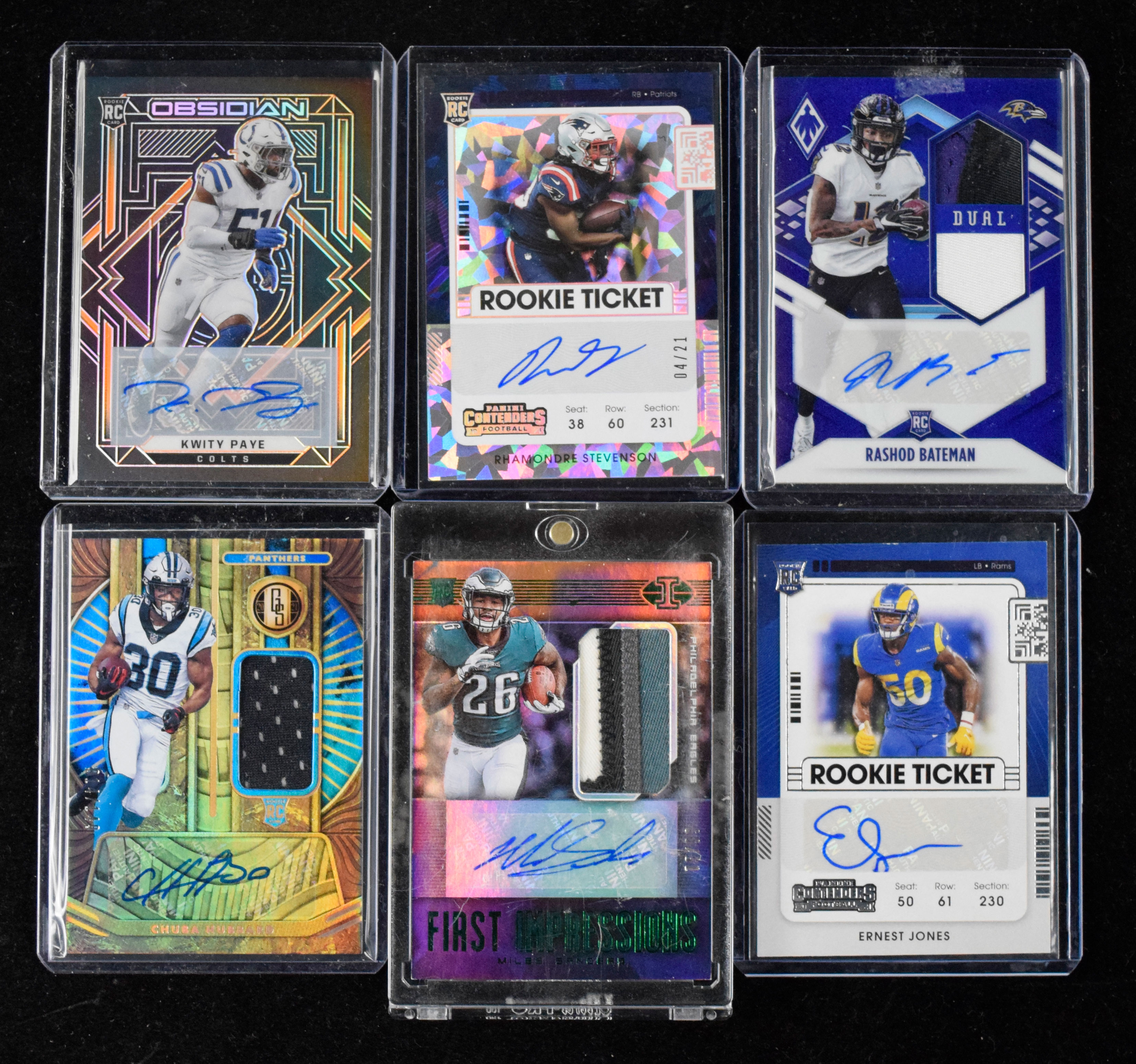Description:Lot of (10) signed football rookie cards including relics & serial numbered (NM-NM/MT). Includes 2019 Panini Certified "Mirror Red" #228 patch card signed by Miles Sanders (#ed 3/199), 2019 Panini Illusions "First Impressions Autographed Memorabilia Green" #130 patch card signed by Miles Sanders (#ed 75/99), 2020 Panini Mosaic "Rookie Autographs Prizm" #RA18 signed by Cole Kmet, 2020 Panini Mosaic "Rookie Scripts" #s RS10 signed by Brandon Aiyuk and RS27 signed by Antonio Gibson, 2021 Panini Contenders #196 signed by Ernest Jones, 2021 Panini Contenders "Cracked Ice Ticket" #133 signed by Rhamondre Stevenson (#ed 4/21), 2021 Panini Gold Standard #219 jersey card signed by Chuba Hubbard (#ed 14/149), 2021 Panini Obsidian "Electric Etch Orange" #167 signed by Kwity Paye (#ed 32/75), and 2021 Panini Phoenix "RPS Rookie Auto Dual Jersey Prime Blue" #RAD-RBA signed by Rashod Bateman (#ed 23/25). Signatures rate 8 to 10 out of 10: NM-NM/MT