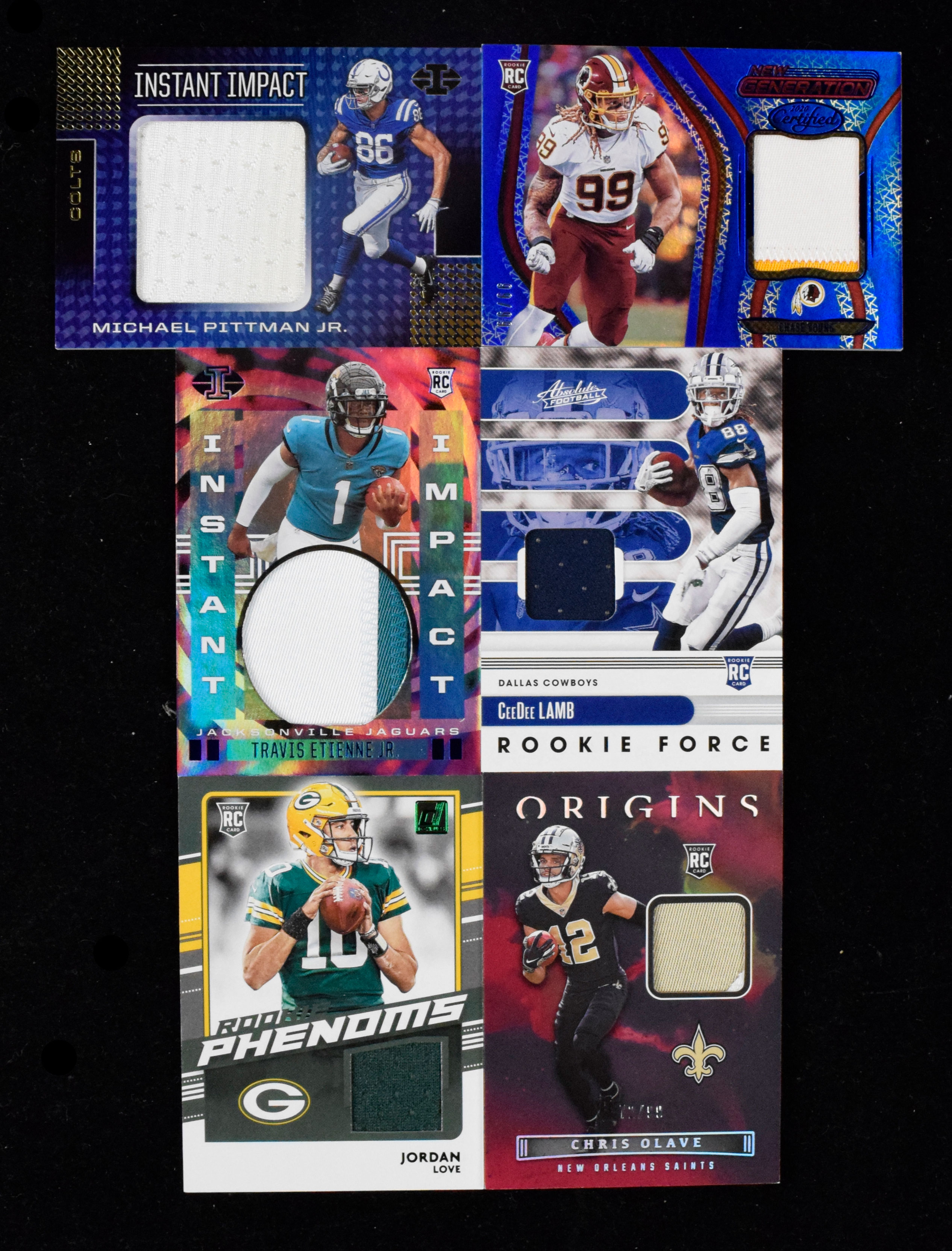 Lot of (11) football rookie relic swatch insert cards (NM-NM/MT overall). Includes 2020 Donruss "Rookie Phenom Jerseys" #RP-JL Jordan Love, 2020 Panini Absolute "Rookie Force" #s 6 CeeDee Lamb and 22 Michael Pittman Jr, 2020 Panini Certified "New Generation Jerseys Mirror Blue" #11 Chase Young (#ed 99/99), 2020 Panini Illusions "Instant Impact" #s II19 Michael Pittman Jr and II21 Chase Young, 2021 Panini Illusions "Instant Impact" #II-KP Kyle Pitts, 2021 Panini Illusions "Instant Impact Blue" #II-TE Travis Etienne (#ed 41/75), 2021 Panini Rookies & Stars "Big Time Relics" #BT-12 Travis Etienne (#ed 102/199), 2021 Panini Spectra "Monumental Memorabilia Hyper" #MM-TE Travis Etienne (#ed 42/75), and 2022 Panini Origins "Rookie Patches Red" #ROP-COL Chris Olave (#ed 72/99): NM-NM/MT overall