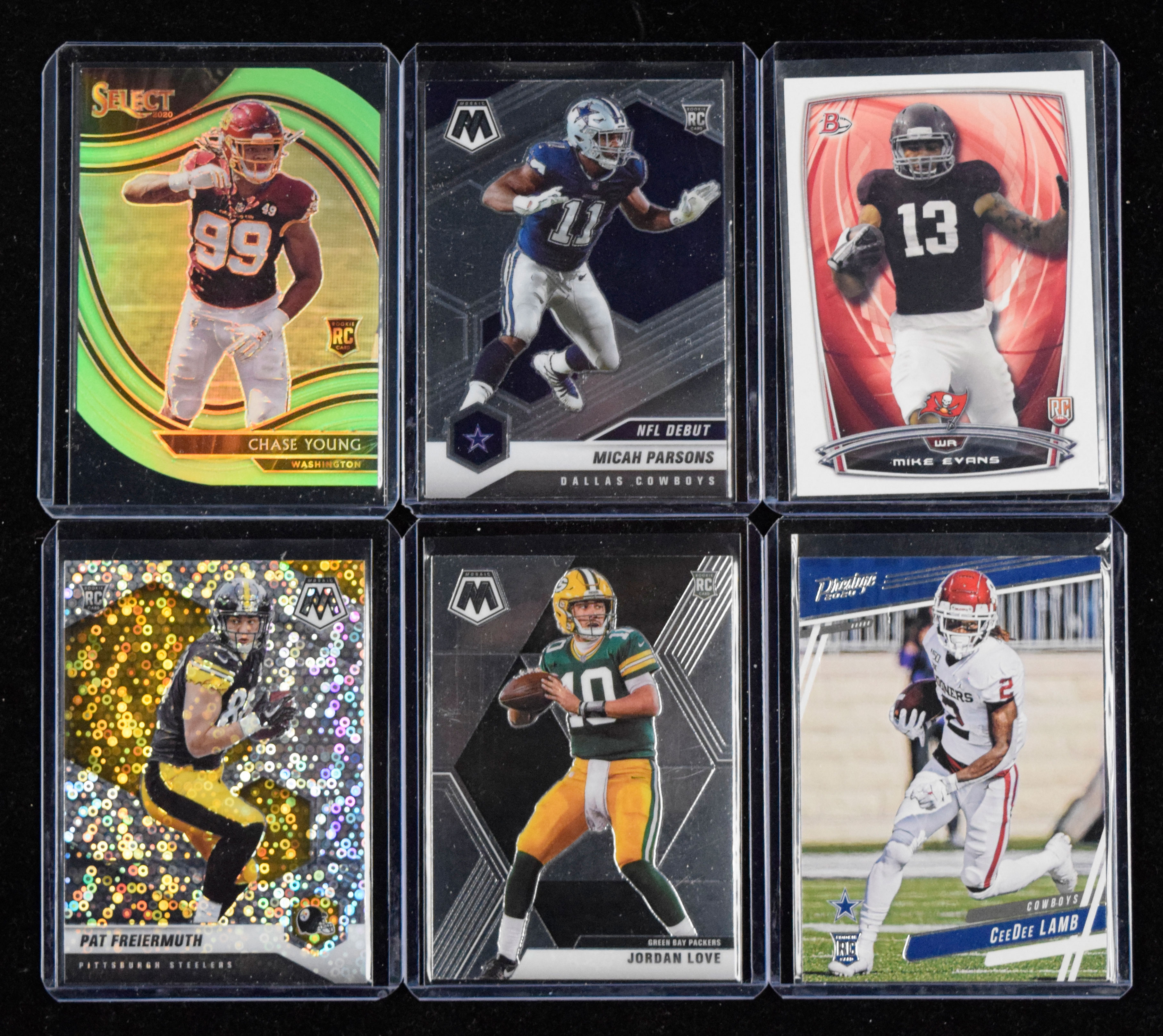 Lot of (22) modern football rookie cards (NM-NM/MT overall). Includes 2014 Bowman "Rookies" #66 Mike Evans; 2014 Bowman "Rookies Black" #8 Odell Beckham Jr; 2020 Donruss #322 Michael Pittman Jr; 2020 Donruss "The Rookies" #TR-CL CeeDee Lamb; 2020 Panini Absolute #s 125 Darnell Mooney and 190 Tee Higgins; 2020 Panini Illusions hobby #12 D'Andre Swift; 2020 Panini Illusions retail #21 Tee Higgins; 2020 Panini Mosaic #s 210 Brandon Aiyuk, 211 Jordan Love, 214 Michael Pittman Jr, and 274 D'Andre Swift; 2020 Panini Prestige #s 218 CeeDee Lamb and 261 Jordan Love; 2020 Panini Rookies & Stars "Rookie Rush" #RR-9 CeeDee Lamb; 2020 Panini Select "Neon Green Prizm Die Cut" #364 Chase Young; 2020 Score #414 Brandon Aiyuk; 2021 Panini Chronicles "Prestige Rookies Update" #203 Justin Fields; 2021 Panini Illusions "Clear Shots" #CS-19 Justin Fields; 2021 Panini Mosaic #s 252 Najee Harris and 257 Micah Parsons; 2021 Panini Mosaic "Rookie Variations No Huddle" #332-V Pat Freiermuth: NM-NM/MT overall
