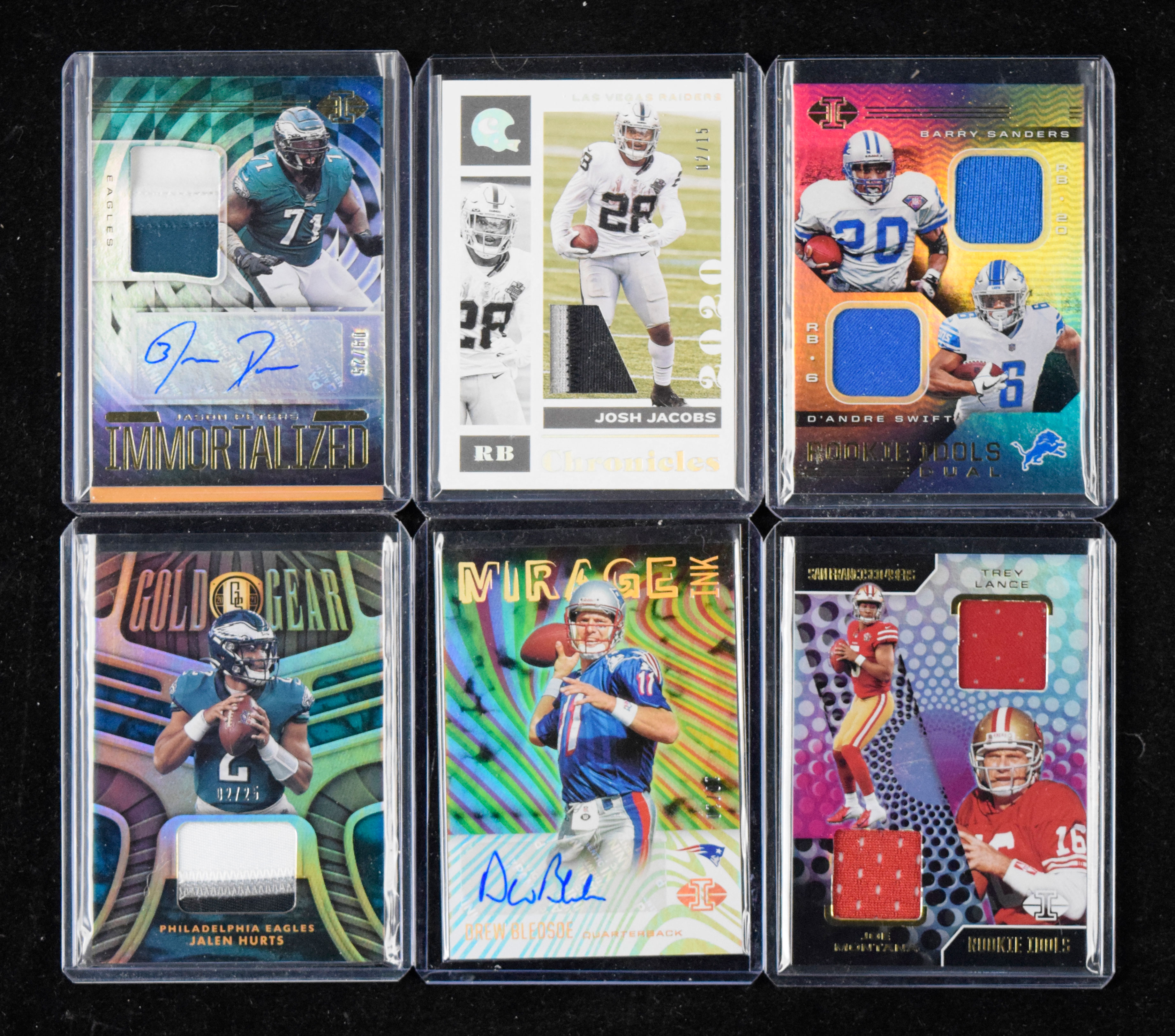 Lot of (17) football signed and relic swatch insert cards (NM-NM/MT overall). Incl. 2014 Bowman "Relics" #42 Cam Newton; 2019 Score "Collegiate Jerseys" #CJ-17 Mike Evans; 2020 Panini Chronicles "Jersey Prime" #52 Josh Jacobs (#ed 2/15); 2020 Panini Illusions "Immortalized Jersey Autographs Gold" #IJ-JP signed by Jason Peters (#ed 9/25); 2020 Panini Illusions "Rookie Idols Dual Memorabilia" #RI-5 Barry Sanders / D'Andre Swift; 2020 Panini Illusions "Superlatives" #s SU14 signed by Matt Leinart; 2020 Panini Illusions "Superlatives Red" #SU57 signed by Keanu Neal (#ed 15/15); 2021 Panini Gold Standard "Gold Gear Prime" #GG-JH Jalen Hurts (#ed 2/25); 2021 Panini Illusions "Mirage Ink Gold" #MI-DB signed by Drew Bledsoe (#ed 10/10); 2021 Panini Illusions "Rookie Idols Dual Memorabilia" #s RI-DED DeVonta Smith / DeSean Jackson & RI-TJ Joe Montana / Trey Lance; 2021 Panini Obsidian "Lightning Strike Electric Etch Orange" #LS-XH signed by Xavien Howard (#ed 17/75); 2021 Panini Phoenix "Gridiron Greats" #GG16 signed by Fred Taylor; 2021 Panini Playbook "Signature Routes" #SRO-DJO signed by Diontae Johnson (#ed 131/199); 2021 Panini Spectra "Brilliance" #B-JAH Jalen Hurts (#ed 12/99); 2021 Panini Spectra "Sky High Signatures Celestial" #SKS-BA signed by Brandon Aiyuk (#ed 30/50); 2022 Panini Immaculate Collection Collegiate "Immaculate Monuments" #IM-1 containing swatches of DeVonta Smith, Tua Tagovailoa, Jameson Williams, Mac Jones (#ed 72/99): NM-NM/MT overall