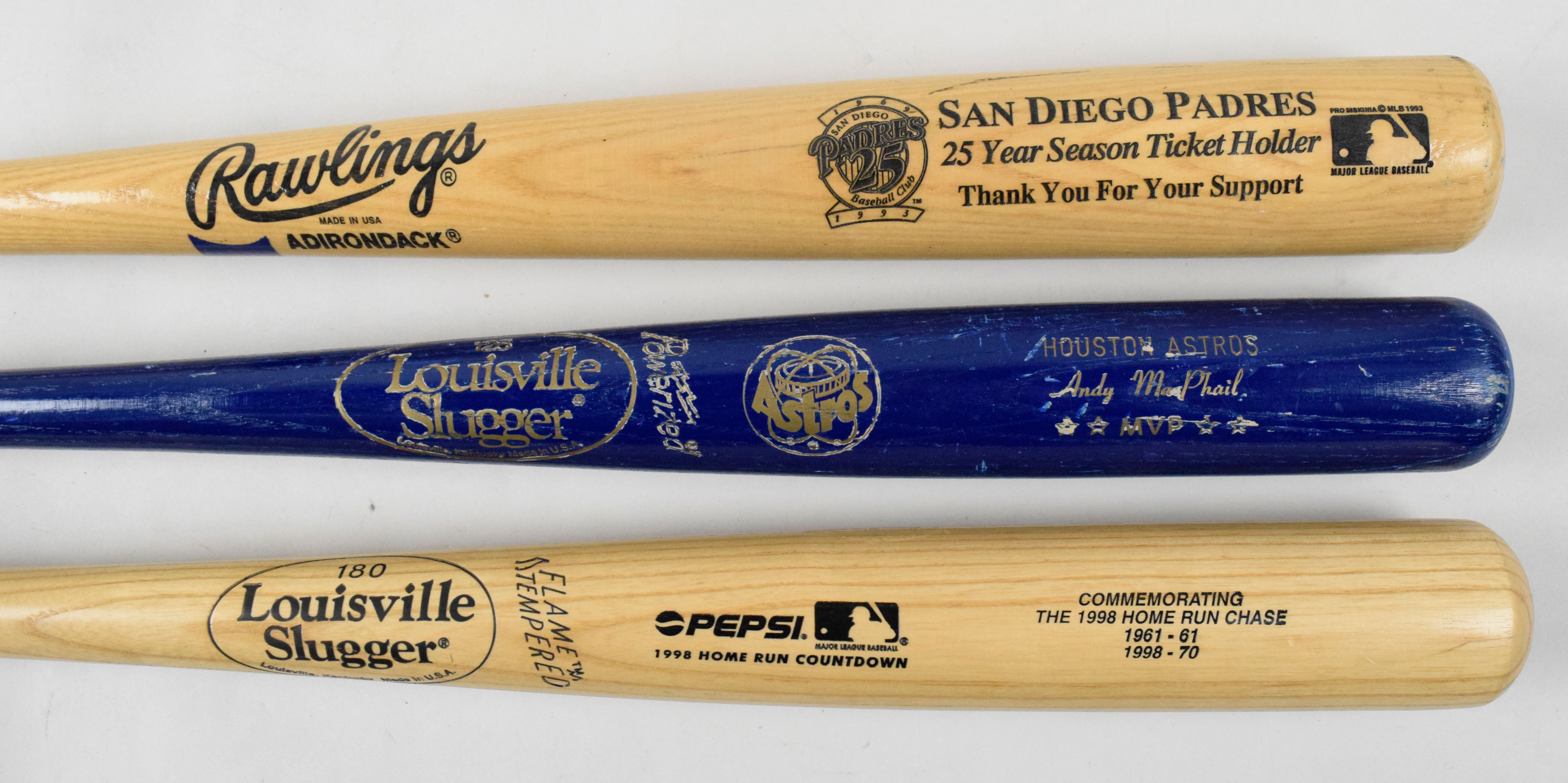 Description:Lot of (7) souvenir and commemorative baseball bats (VG-NM). Includes c.late 1960s 32" Hillerich & Bradsby Co. Washington Senators stadium giveaway bat (VG), 33" 1974 Louisville Slugger 125 Hank Aaron 715th HR commemorative bat (EX/MT), c.1982-85 34" Louisville Slugger 125 Houston Astros "Andy MacPhail MVP" bat (VG-VG/EX), c.1990s 34" Cooperstown Bat Co. Baseball HOF commemorative bat (NM), 34" Rawlings-Adirondack 1993 San Diego Padres 25 Year Season Ticket Holder bat (EX/MT), 35" Heavy Hitter Industries Inc. Los Angeles Dodgers 6/10/1995 Upper Deck Heroes Of Baseball bat (EX/MT-NM), and 34" Louisville Slugger 1998 Home Run Chase commemorative bat (NM).