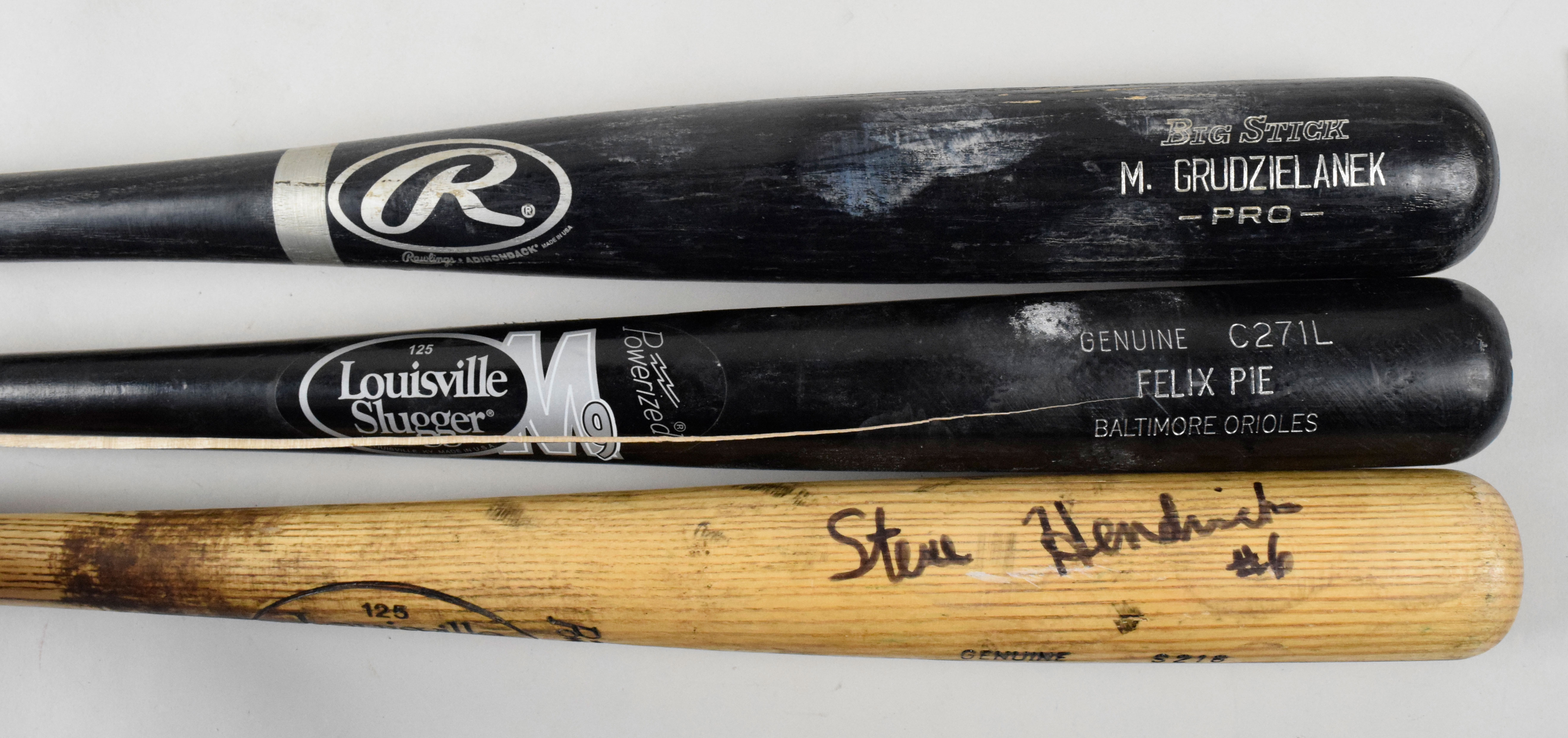 Description:Lot of (6) professional model baseball bats, c.1980-2010 (FR/GD-VG). Includes c.1980-83 34.5" Louisville Slugger P89XL Kurt Bevacqua model bat (VG heavy use), c.1987-89 34" Louisville Slugger S216 Steve Hendricks model bat signed by Hendricks in black marker rating 8 out of 10 (G/VG cracked), 2003 34" Rawlings-Adirondack 456B Mark Grudzielanek model bat (G/VG cracked), c.2005-08 34" Old Hickory M1926 Matt Murton model bat signed by Murton in silver marker rating 8/9 out of 10 (GD large portion of handle cracked off), 2006 33" Louisville Slugger C271 Juan Pierre model bat (G/VG cracked), and 2010 33.5" Louisville Slugger C271L Felix Pie model bat (FR/GD very long crack).