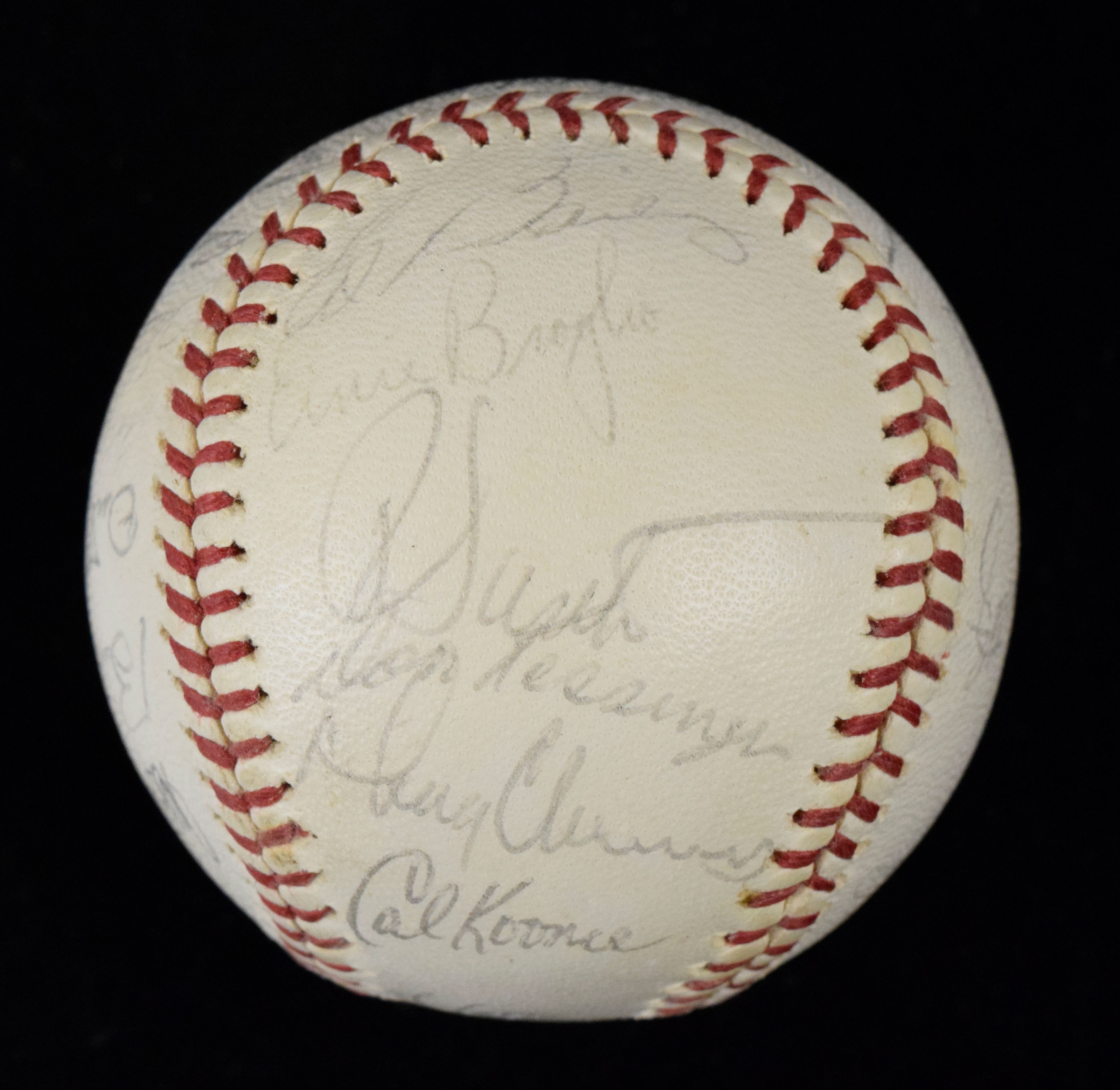 Description:1965 Chicago Cubs team signed baseball (EX/MT). W.Giles NL ball signed by (26) members of the 1965 Cubs including Lou Klein, Ron Santo, Ernie Banks, Billy Williams, Ted Abernathy, Lindy McDaniel, Larry Jackson, Cal Koonce, Dick Ellsworth, Don Landrum, Bill Faul, Bob Humphreys, Bill Hoeft, Joe Amalfitano, Glenn Beckert, Doug Clemens, Don Kessinger, and others. Signatures rate 7 to 8/9 out of 10. Minor toning: EX/MT