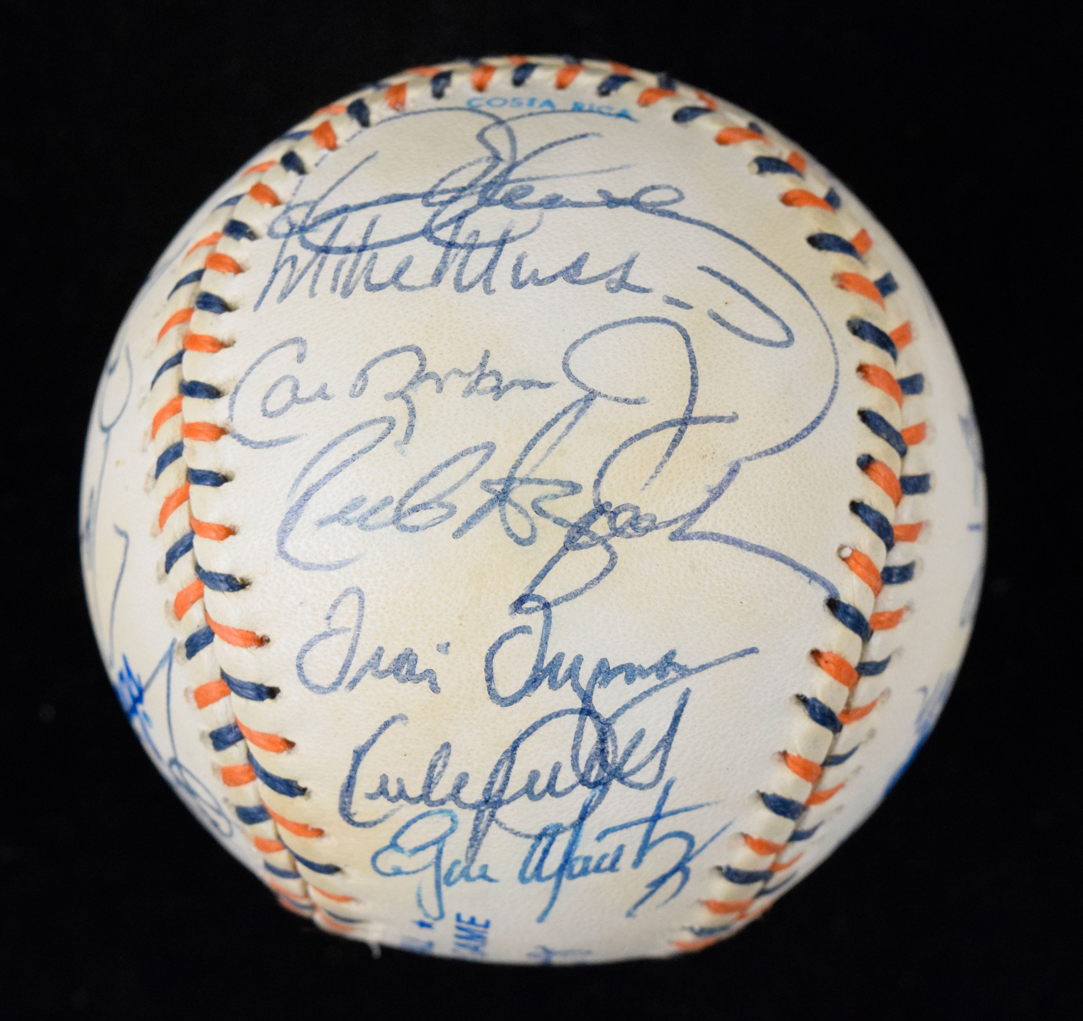 Description:1992 American League All-Stars team signed baseball (EX). Rawlings official 1992 All-Star Game ball signed by (27) members of the AL team including Tom Kelly, Kirby Puckett, Wade Boggs, Cal Ripken Jr, Ken Griffey Jr, Roberto Alomar, Ivan Rodriguez, Paul Molitor, Edgar Martinez, Dennis Eckersley, Mike Mussina, Mark McGwire, Roger Clemens, Kevin Brown, Joe Carter, Sandy Alomar Jr, and others. Signatures rate 7 to 9/10 (avg 8/9) out of 10. Scattered areas of light to moderate toning: EX