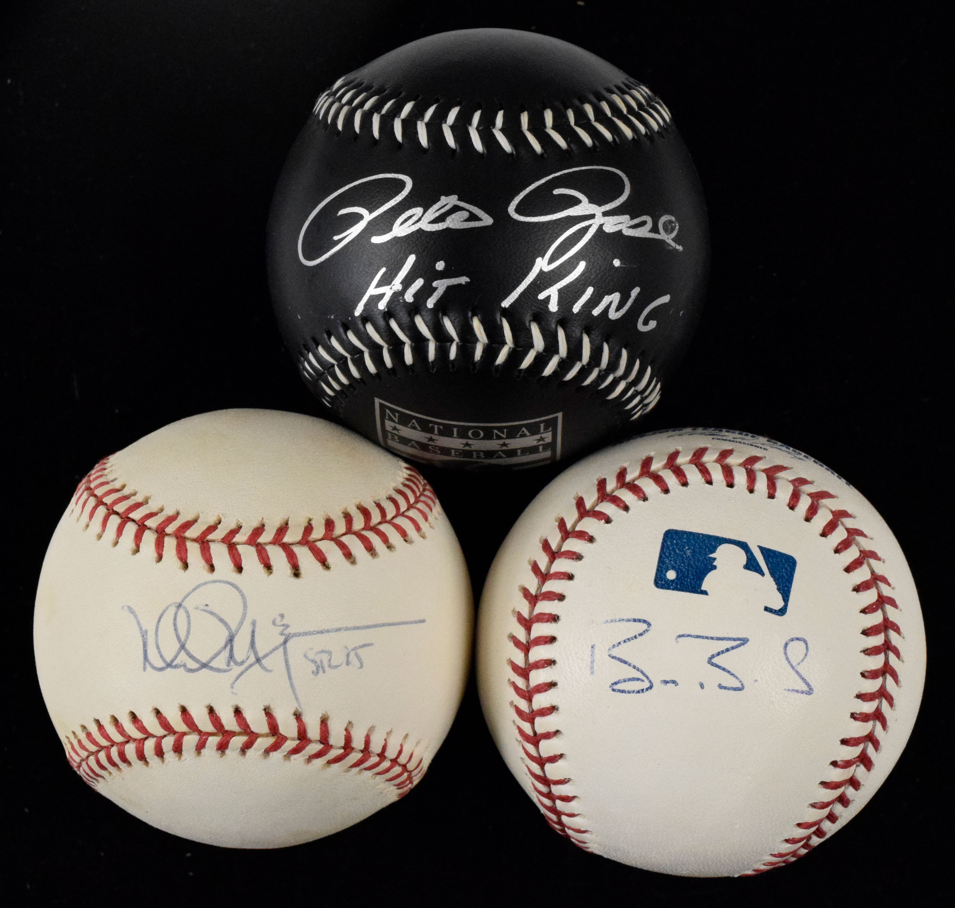 Description:Pete Rose, Mark McGwire, and Barry Bonds signed baseballs (EX-NM/MT). Includes a black leather Baseball HOF logo ball signed by Pete Rose with "Hit King" inscription, B.Selig ML ball signed by Barry Bonds, and L.Coleman NL ball (toning) signed by Mark McGwire with "STL 25" inscription. Signatures rate 8 to 9/10 out of 10: EX-NM/MT