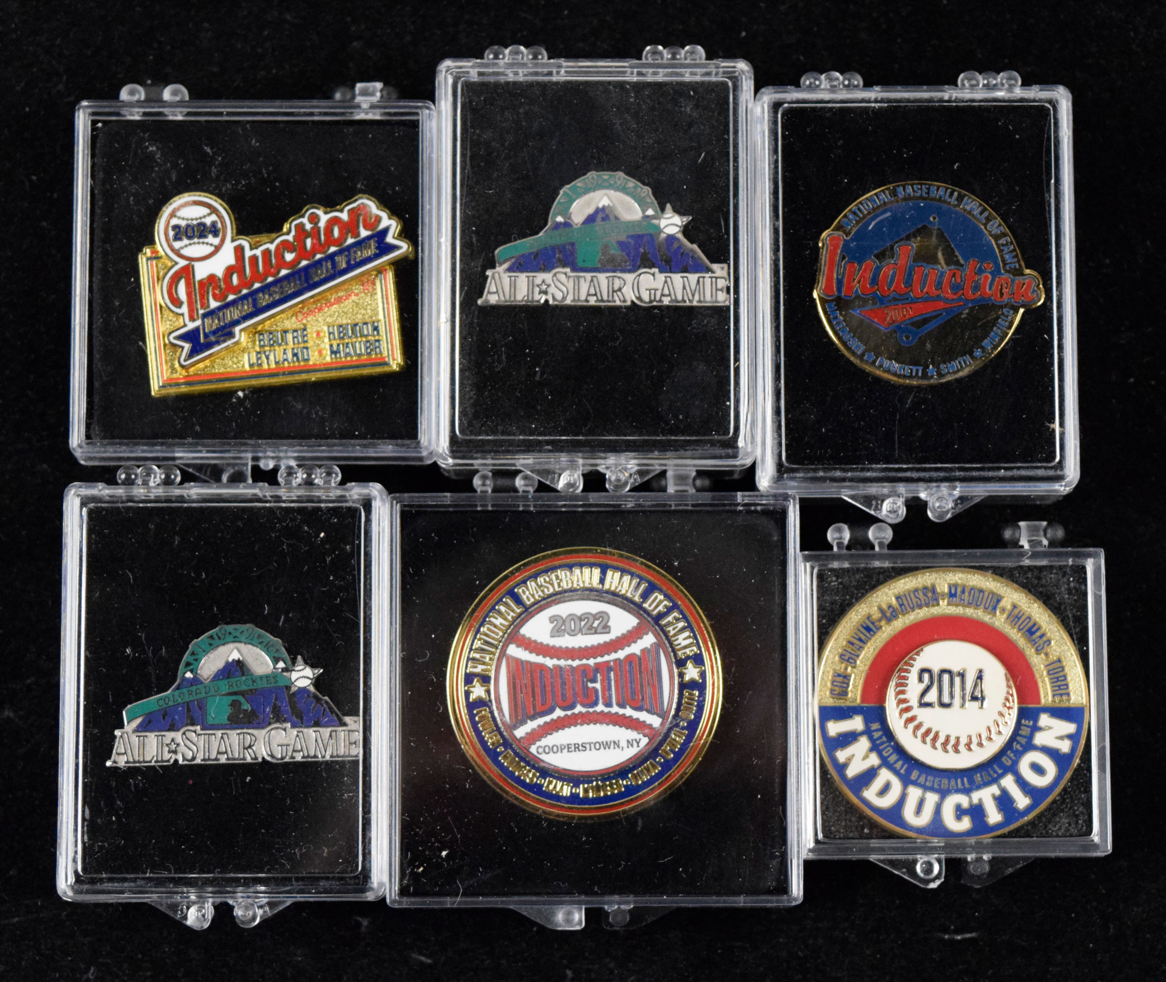 Lot of (24) All-Star Game & Baseball HOF Induction press pins & charms from 1985-2024 (EX-NM/MT). All-Star Game include 1985 pin, 1990 pin, 1996 pin, 1997 pin, (3) 1998 pins, (2) 1999 pins, 2000 pin, and (2) 2001 pins. HOF Induction include 1995 pin, (2) 1998 pins, 1998 charm, (2) 2001 pins (one stained around edges), (2) 2014 pins, (2) 2022 pins, and (2) 2024 pins. Most appear to average NM overall. Range: EX-NM/MT