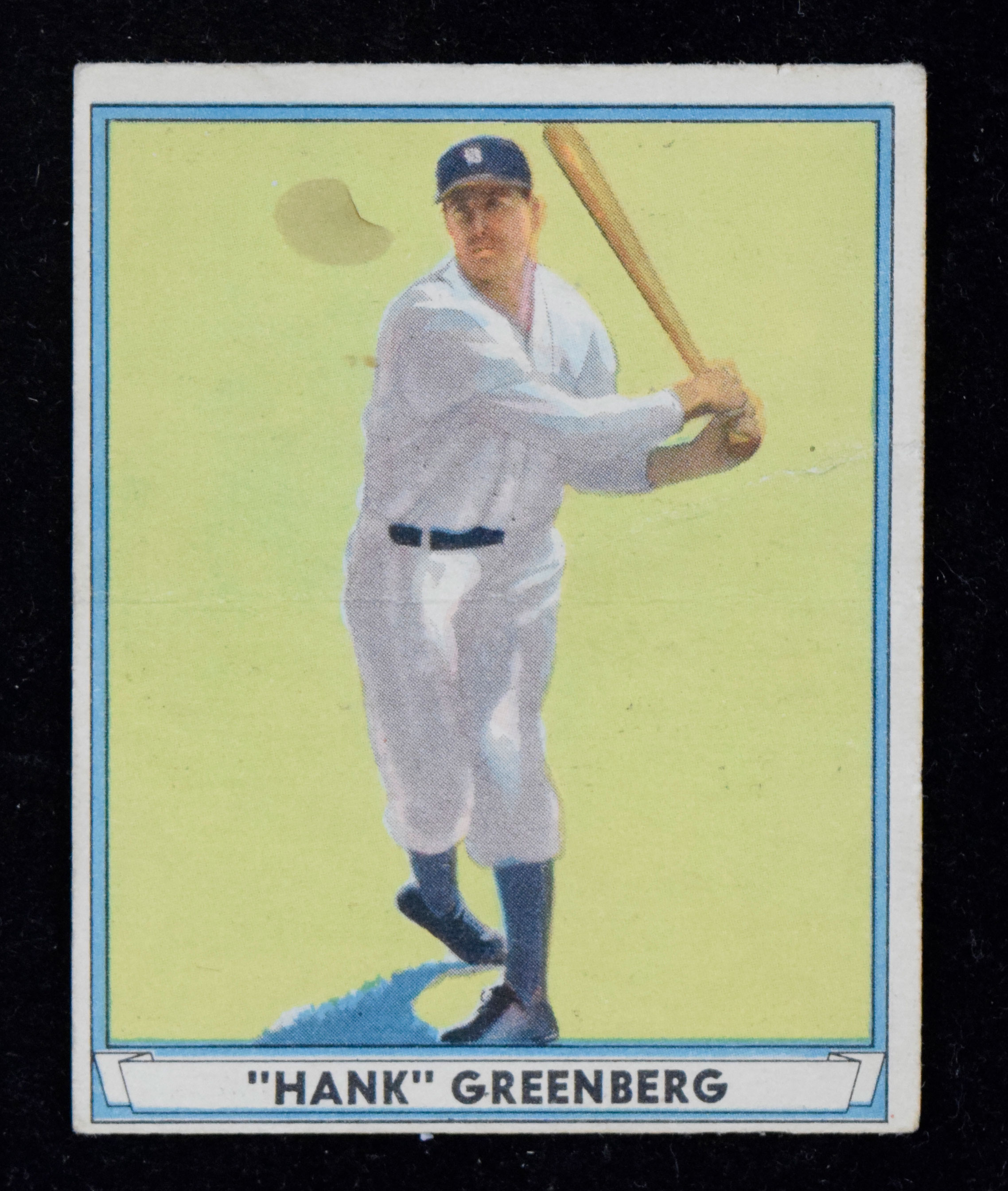 Description:1941 Play Ball #18 Hank Greenberg (PR). Off-condition copy of the Hall of Famer has a small stain on the front near Greenberg's face that shows through to the back, as well as several heavy creases: PR.