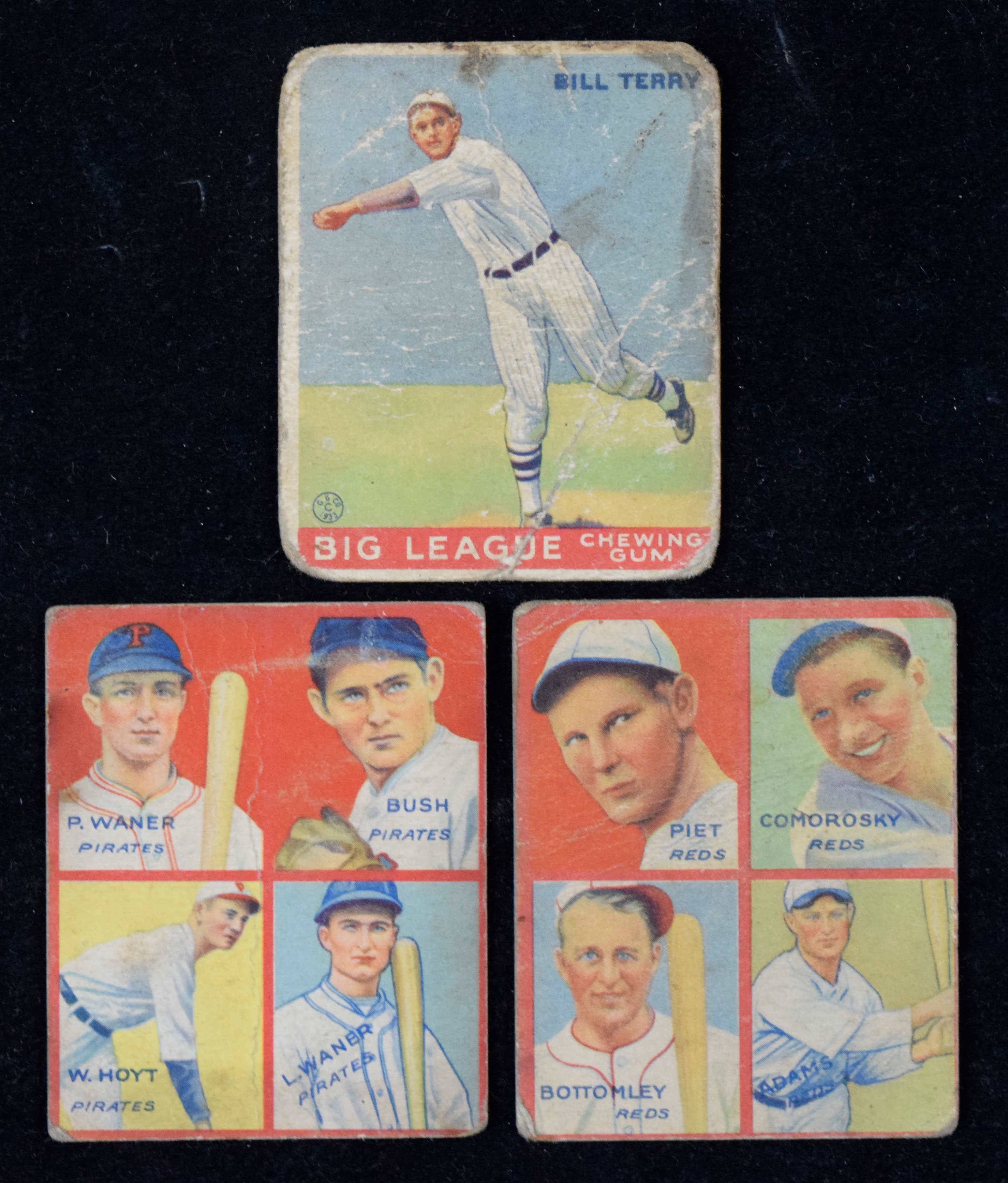 Description:Lot of (3) 1933-1935 Goudey cards, including Terry, Waner and Bottomley (PR). High-value but low-grade lot of cards featuring Hall of Famers, with 1933 Goudey #20 Bill Terry (PR) and (2) 1935 Goudey 4-in-1 cards: Paul Waner/Guy Bush/Waite Hoyt/Lloyd Waner (PR) and Sparky Adams/Adam Comorosky/Jim Bottomley and Tony Piet (PR). Range: PR.