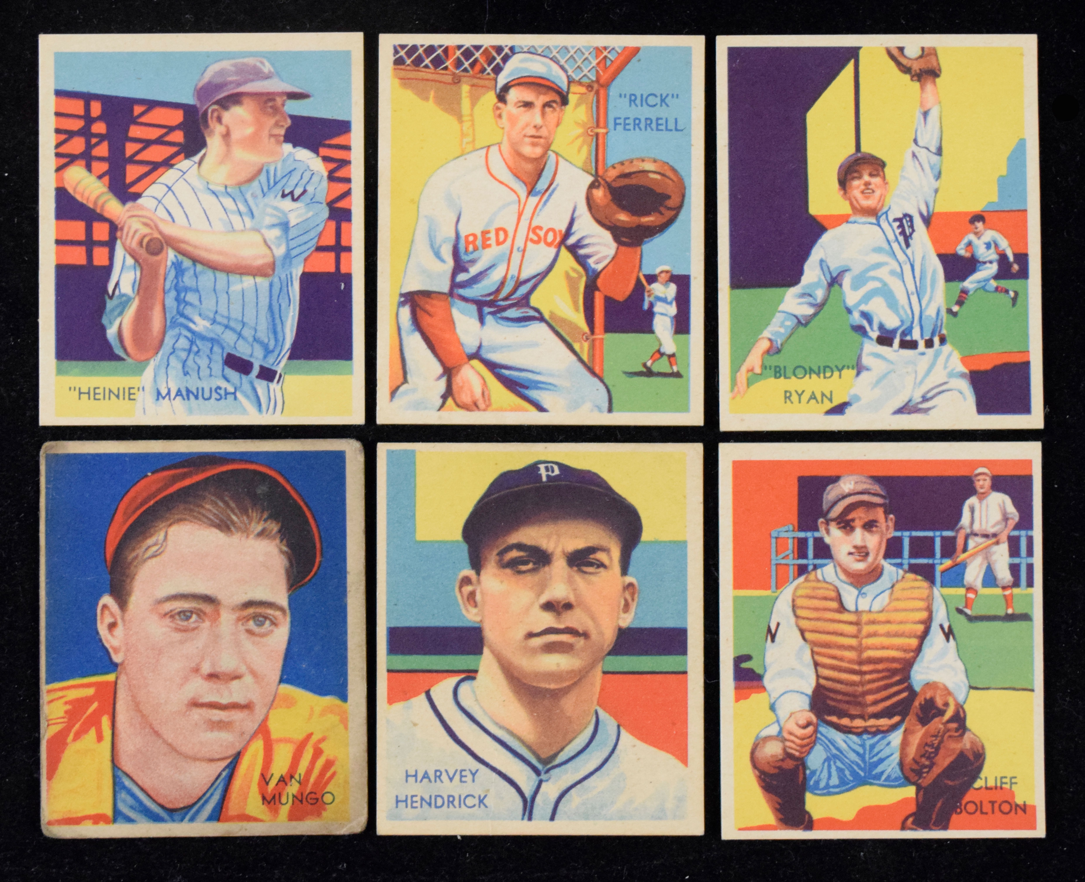 Description:Lot of (6) 1934-1936 Diamond Stars, with Manush, Ferrell (poss. trimmed; see description) Lot appears very sharp EX/MT-NM overall (with the exception of one PR noted below), but most measure short and are possibly trimmed on one or more sides. Includes #s 30 Heinie Manush (W on sleeve), 47 Cliff Bolton, 40 Blondy Ryan, 48 Rick Ferrell, 41 Harvey Hendrick and 19 Van Mungo (PR). Range: PR-possibly trimmed; see description.