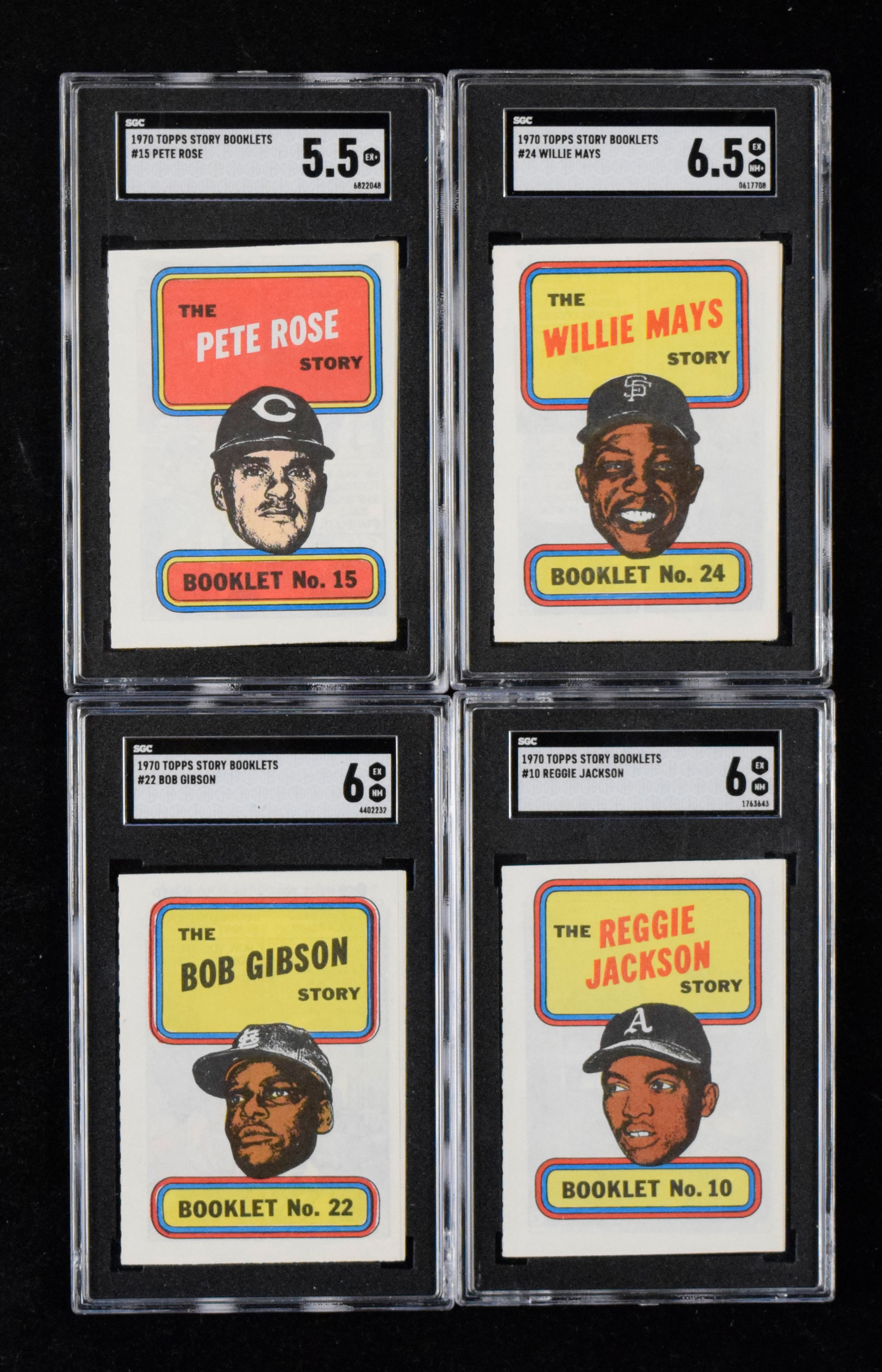 Description:1970 Topps Booklets SGC-graded complete set (24) with Mays, Jackson (SGC 4.5 VG/EX+ - SGC 6.5 EX/MT+). Colorful oddball set is housed in a graded card binder, with each booklet encapsulated by SGC. Full grading composite is as follows: (1) SGC 6.5 EX/MT+: #24 Willie Mays; (8) SGC 6 EX/MT: #s 1 Mike Cuellar, 2 Rico Petrocelli, 6 Bill Freehan, 7 Wally Bunker, 8 Tony Oliva, 9 Bobby Murcer, 10 Reggie Jackson, and 22 Bob Gibson; (9) SGC 5.5 EX+: #s 3 Jay Johnston, 4 Walt Williams, 11 Tommy Harper, 13 Orlando Cepeda, 14 Ernie Banks, 15 Pete Rose, 16 Denis Menke, 19 Cleon Jones, 23 Al Ferrara; (5) SGC 5 EX: #s 5 Vada Pinson, 17 Bill Singer, 18 Rusty Staub, 20 Deron Johnson, and 21 Bob Moose and (1) SGC 4.5 VG/EX+: #12 Mike Epstein. Range: SGC 4.5 VG/EX+ - SGC 6.5 EX/MT+.