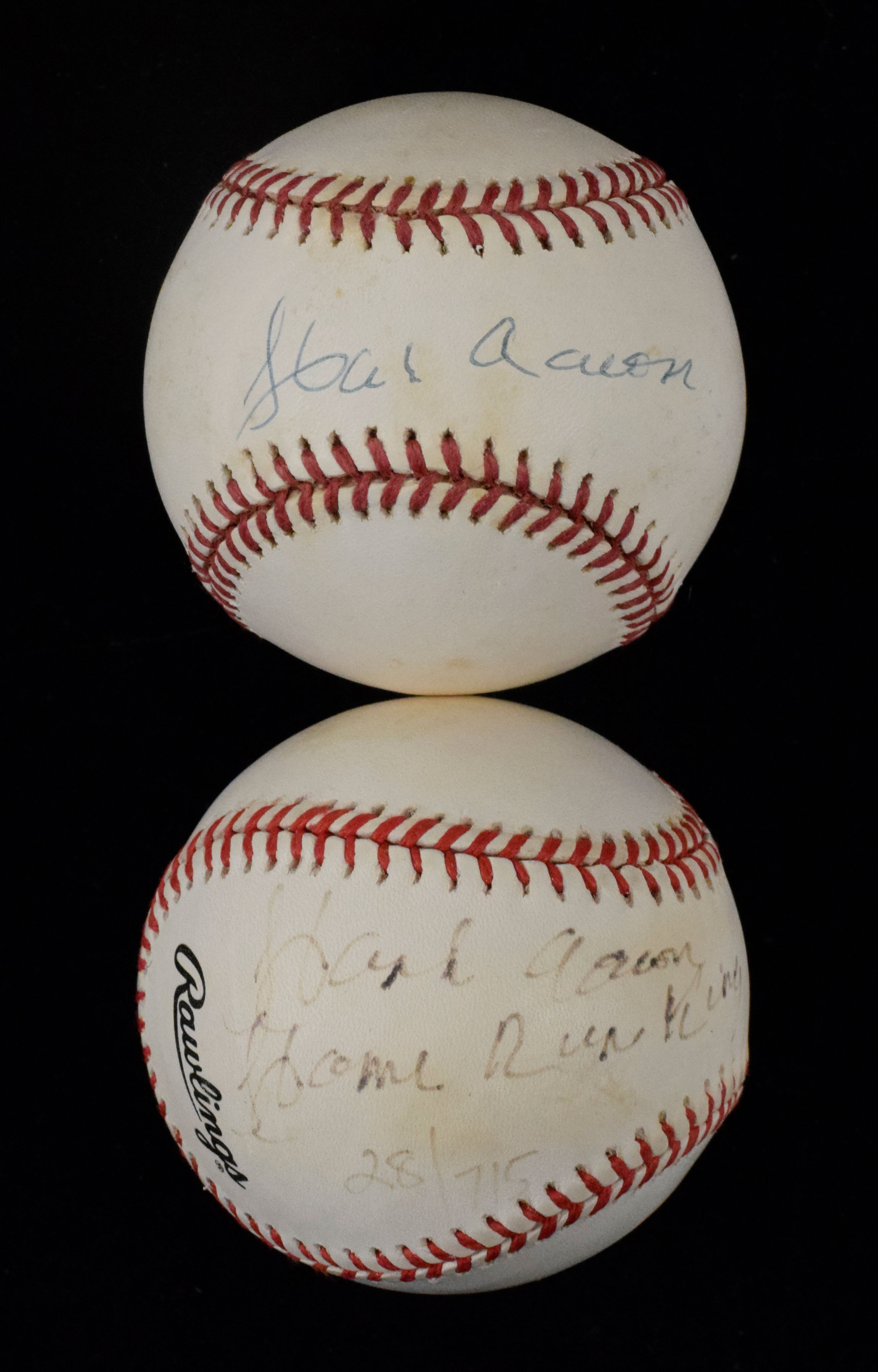 Description:Lot of (2) Hank Aaron autographed L. Coleman baseballs, including with "HR King" inscription (Sigs. EX-NM). Nice lot of single-signed baseballs, each signed by Aaron on a L. Coleman N.L. ball. Includes (1) signed on the sweet spot, rating 7 out of 10 and (1) signed on a side panel with "Home Run King; 28/715" inscription, with some fading, rating 5 out of 10. Balls have moderate toning: EX. Sig. range: EX-NM.