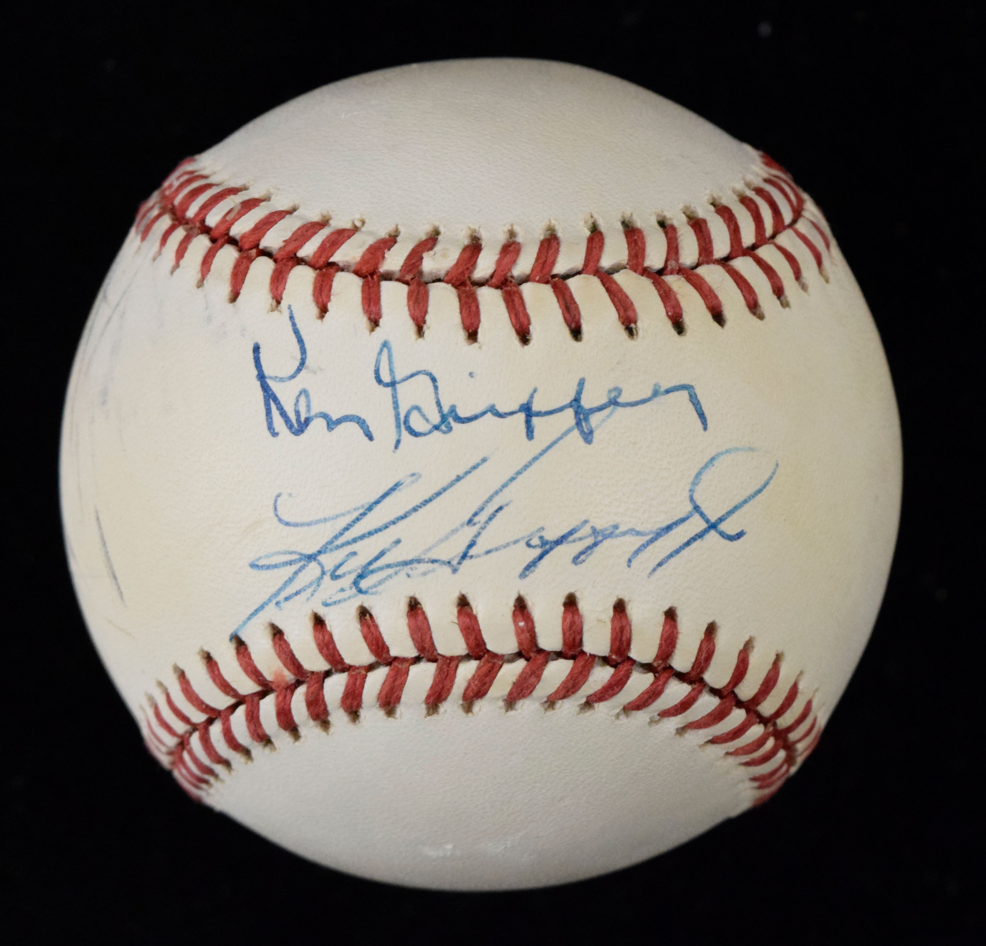 Description:Ken Griffey and Ken Griffey Jr. autographed B. Brown baseball (Sigs. NM/MT-MT). Outstanding B. Brown A.L. baseball has been signed on the sweet spot by father and son, with signatures rating 8/9 out of 10. Ball has some scuffing/wear and toning not affecting the signatures: VG/EX.