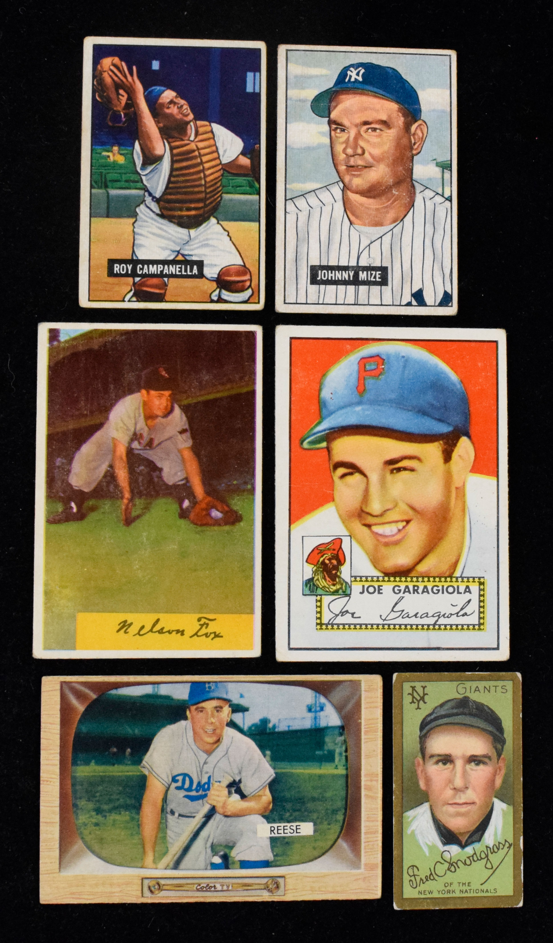 Description:Lot of (26) 1911-1955 baseball cards, including T205 Snodgrass, 1951 Bowman Campanella (FR-VG/EX). Includes (1) 1911 T205 Gold Borders Fred Snodgrass; (13) 1951 Bowman cards, highlighted by #s 50 Johnny Mize and 31 Roy Campanella; (1) 1952 Topps #227 Joe Garagiola; (3) 1954 Bowman cards: #s 97 Gil McDougald, 6 Nellie Fox and 113 Allie Reynolds; and (8) 1955 Bowman cards, highlighted by #s 37 Pee Wee Reese, 213 George Kell and (2) Umpire cards: #s 281 and 284. Most cards appear VG with some better and some worse. Range: FR-VG/EX.