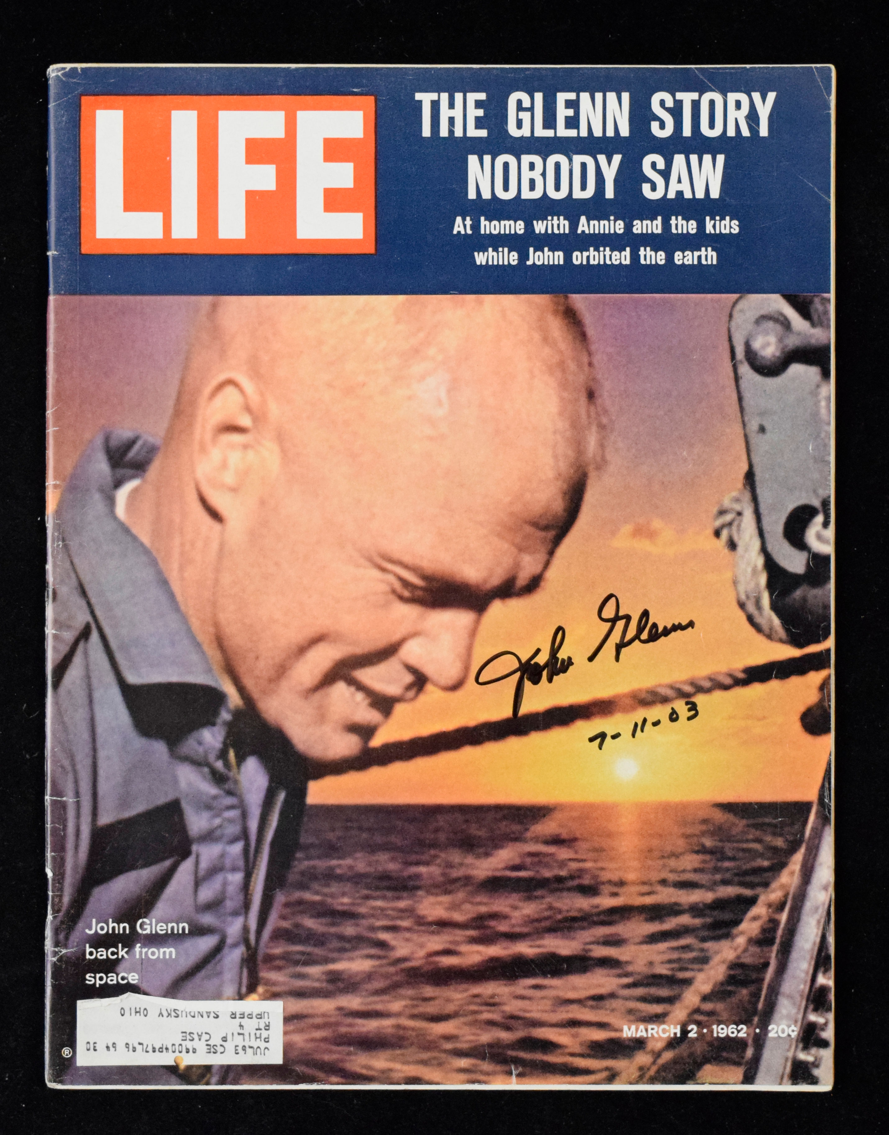 Description:John Glenn signed 1962 Life magazine (EX). March 2nd issue signed by Glenn in black marker and dated "7-11-03". Signature rates 9/10 out of 10. Normal handling wear: EX