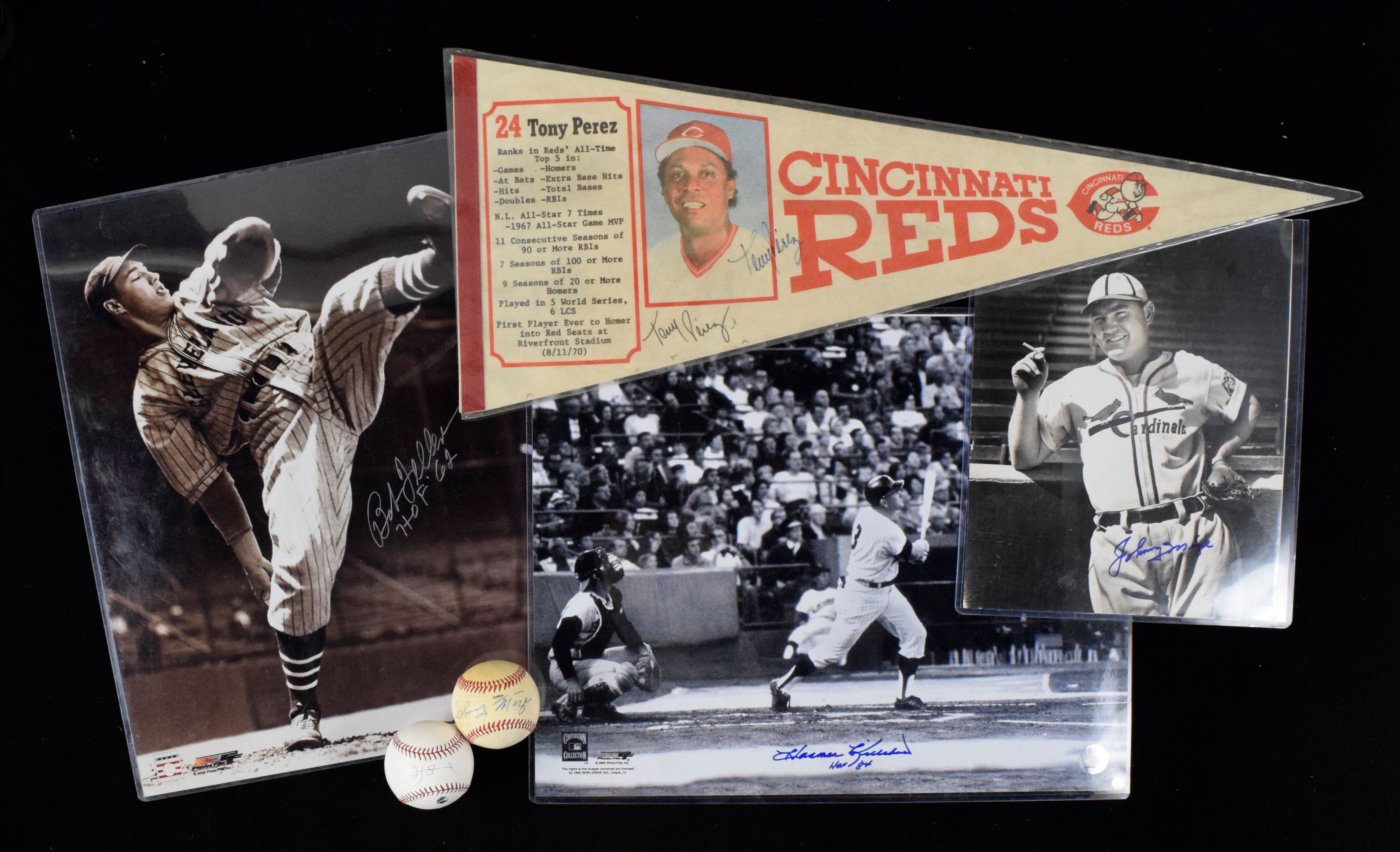 Description:Baseball HOFers autograph lot (VG/EX-NM/MT). Includes St. Louis Cardinals logo ball (toning) signed by Johnny Mize; (3) signed 16"x20" photos: Bob Feller with "HOF 62" inscription, Harmon Killebrew with "HOF 84" inscription, and Orlando Cepeda with "HOF 99" inscription (all 3 MLB Authenticated); (2) vintage 10.5"x13.5" photos signed by Johnny Mize (corner/edge wear); 29.5" Tony Perez pennant signed by Perez; and B.Selig ML ball signed by Jim Leyland (MLB Authenticated). Signatures rate 7/8 (Perez) to 10 (avg 8/9) out of 10. Most items appear to average EX-EX/MT overall. Range: VG/EX-NM/MT