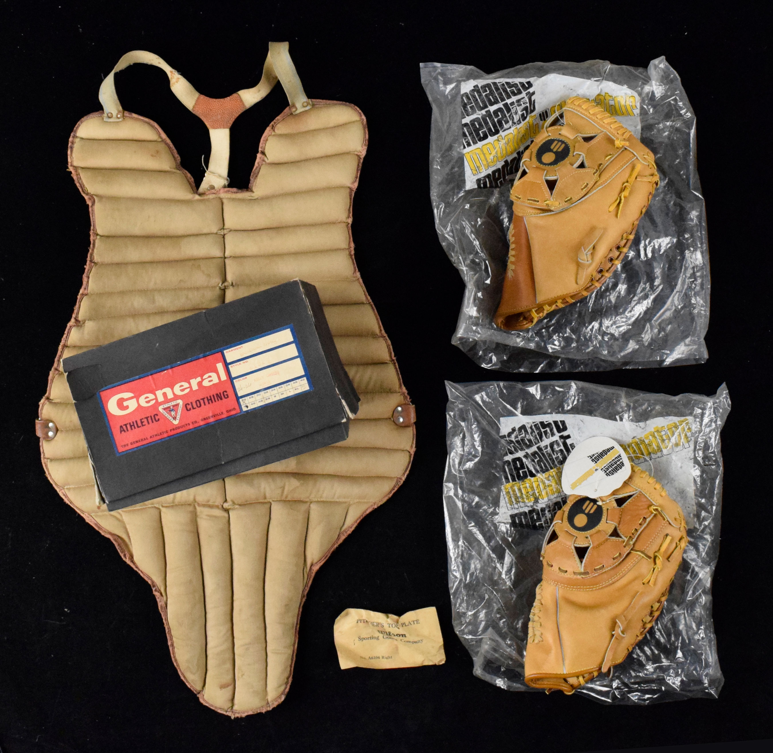 Description:Lot of vintage sports equipment, c.1920s-70s (PR/FR-NM/MT). Includes c.1920s-30s Draper-Maynard wrestling headgear, c.1930s Denkert 220 Rolly Hemsley model catcher's mitt (VG), c.1930s Excelsior brand Eddie Phillips model catcher's mitt (VG), c.1940s-50s Hutch football pants, c.1950s Hutch 165 Whitey Lockman model 1st base mitt (GD/VG), c.1950s Wilson chest protector, 1950s-60s Wilson pitcher's toe plate (unopened), (5) c.1960s General Athletic Products Co. basketball shorts, (2) c.1970s Medalist GT-1800 Ernie Banks model 1st base mitts (NM-NM/MT), and some other vintage equipment. Most items appear to average VG/EX overall. Range: PR/FR-NM/MT