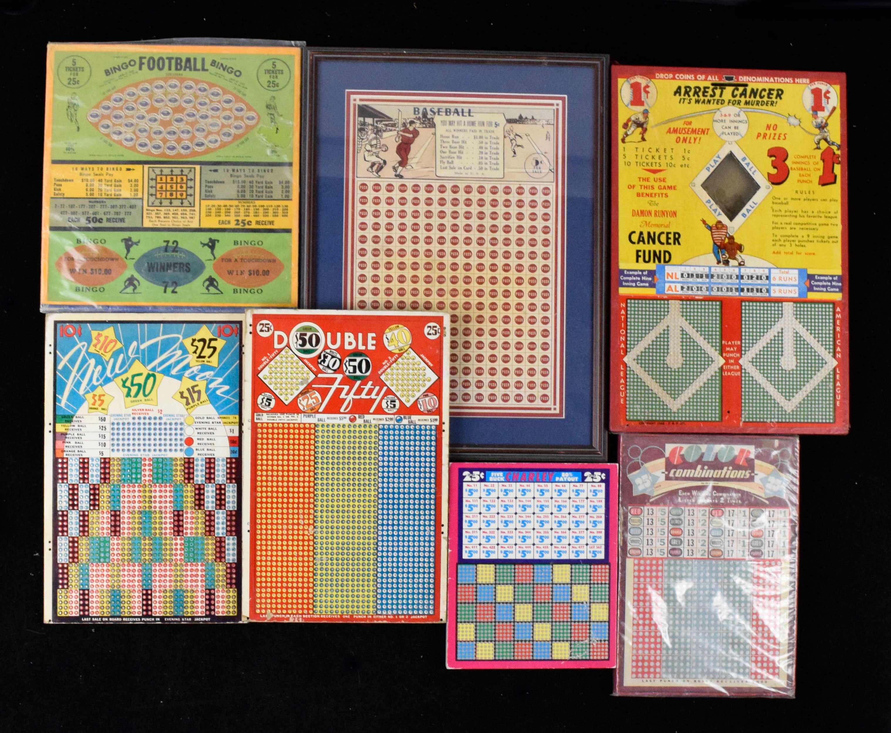 Description:Lot of approx. (35) vintage punch board games, c.1930s (VG-NM). Most are sports themed, but some nonsports are included. The majority are the larger size with hard edges, with a smaller number of cardboard games mixed in. Various conditions throughout the lot. Most appear to average EX overall. Range: VG-NM