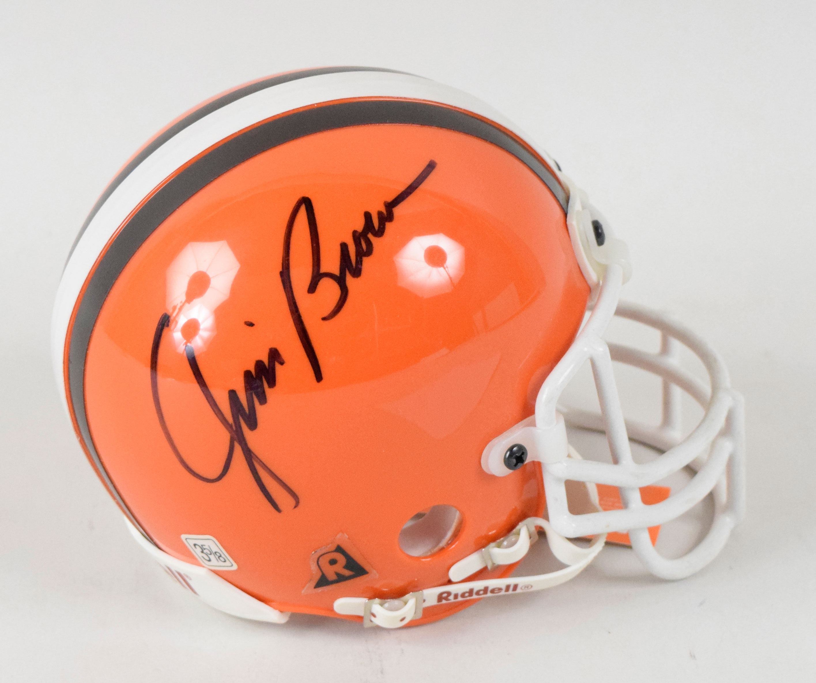 Description:Jim Brown signed Cleveland Browns mini helmet - Steiner (NM). Brown signed the helmet in black marker. Signature rates 9 out of 10. Online Authentics and Steiner authentication stickers are on the helmet (Steiner COA not present): NM