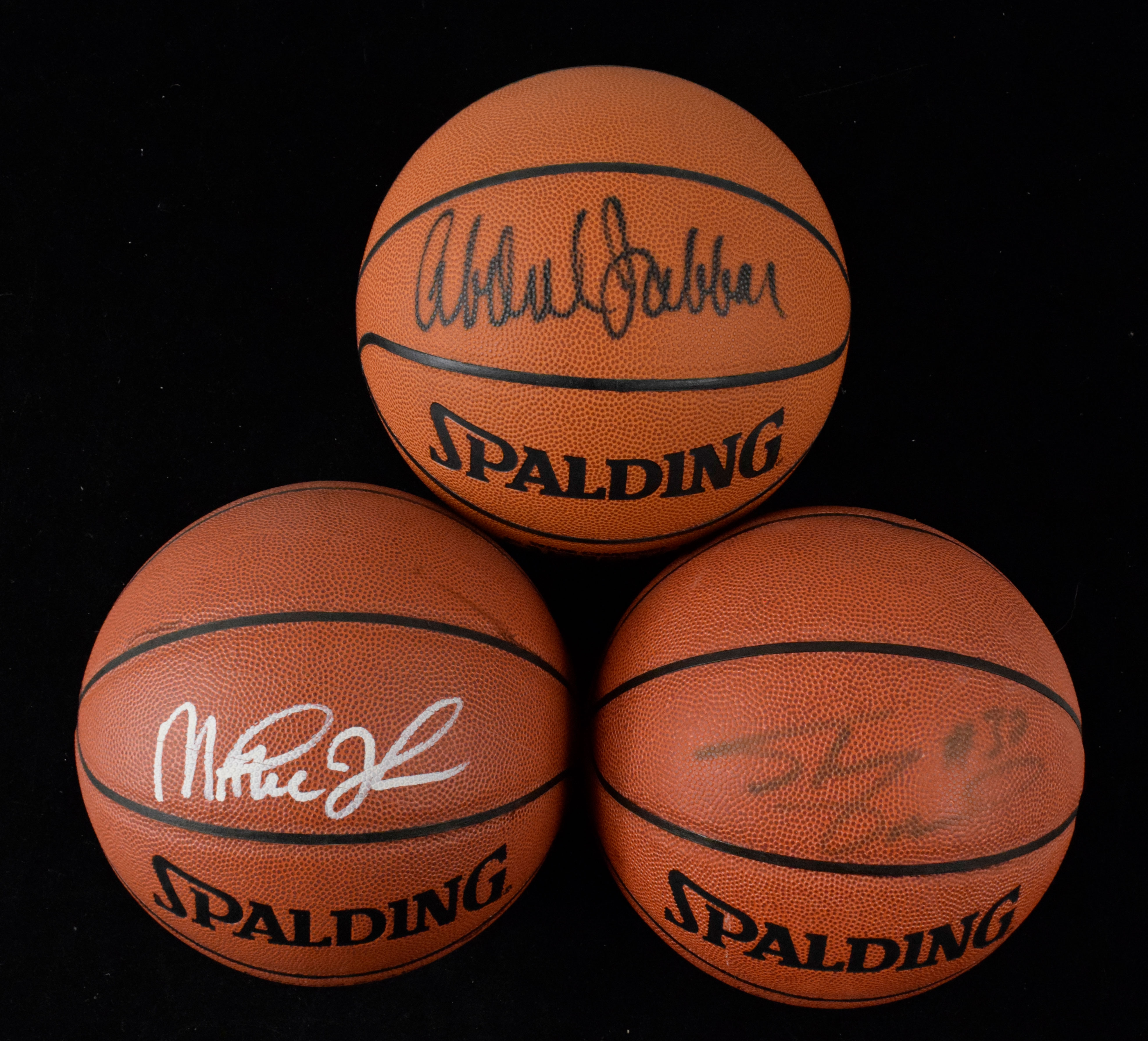 Description:Magic Johnson, Shaquille O'Neal, and Kareem Abdul-Jabbar signed basketballs (EX-NM). Includes a Spalding NBA indoor/outdoor basketball signed by Magic Johnson in white paint pen rating 8/9 out of 10 (EX-EX/MT), Spalding NBA indoor/outdoor ball signed by Shaquille O'Neal in black marker rating 5/6 out of 10, and Spalding NBA indoor/outdoor ball signed by Abdul Jabbar in black marker rating 9 out of 10 (NM).