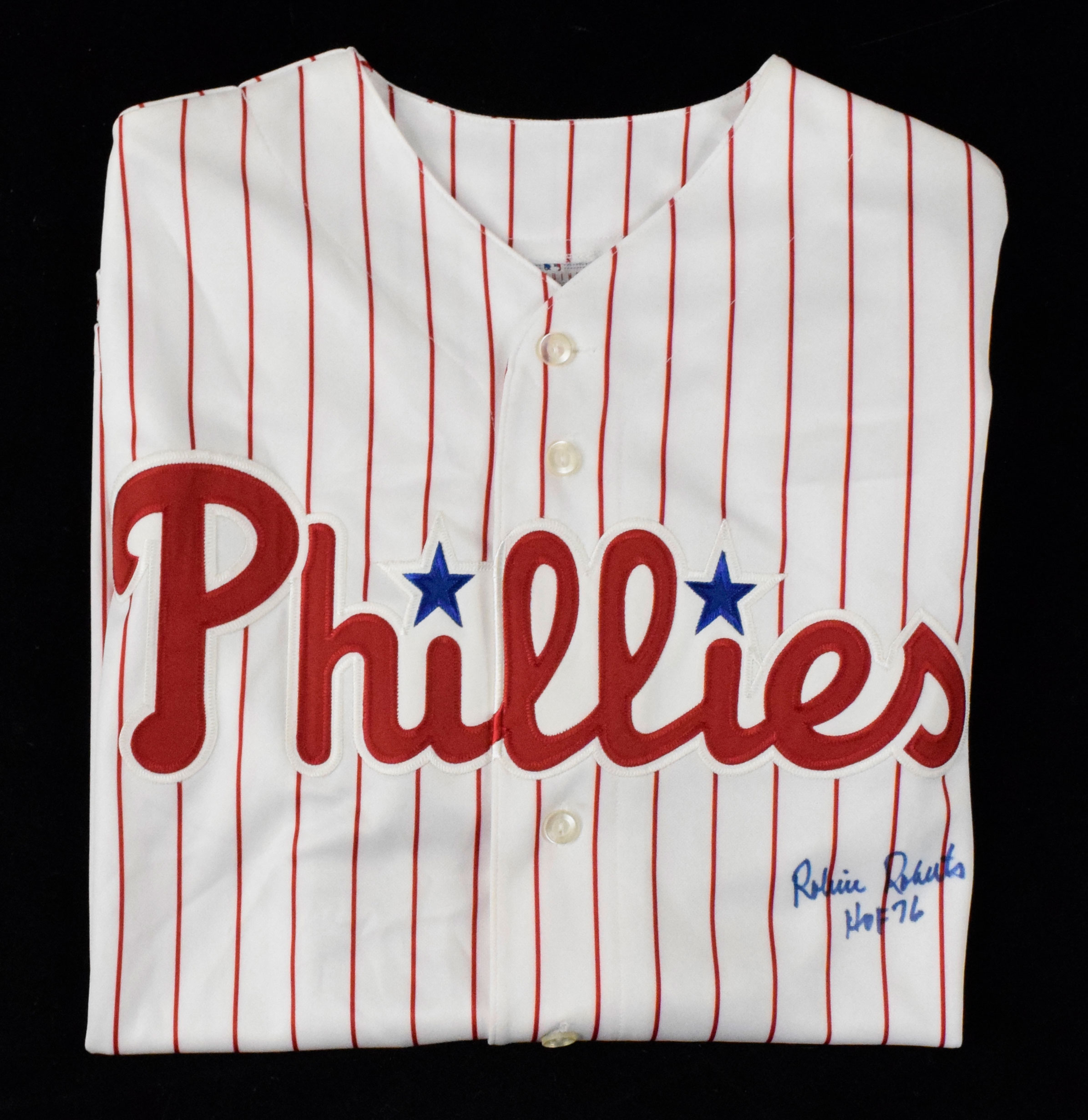 Description:Robin Roberts signed & inscribed Philadelphia Phillies jersey - MLB Authenticated (NM). Majestic size L Phillies jersey signed by Roberts in blue marker with "HOF 76" inscription. Signature rates 9 out of 10. MLB Authenticated serial #ed hologram sticker is on the jersey: NM