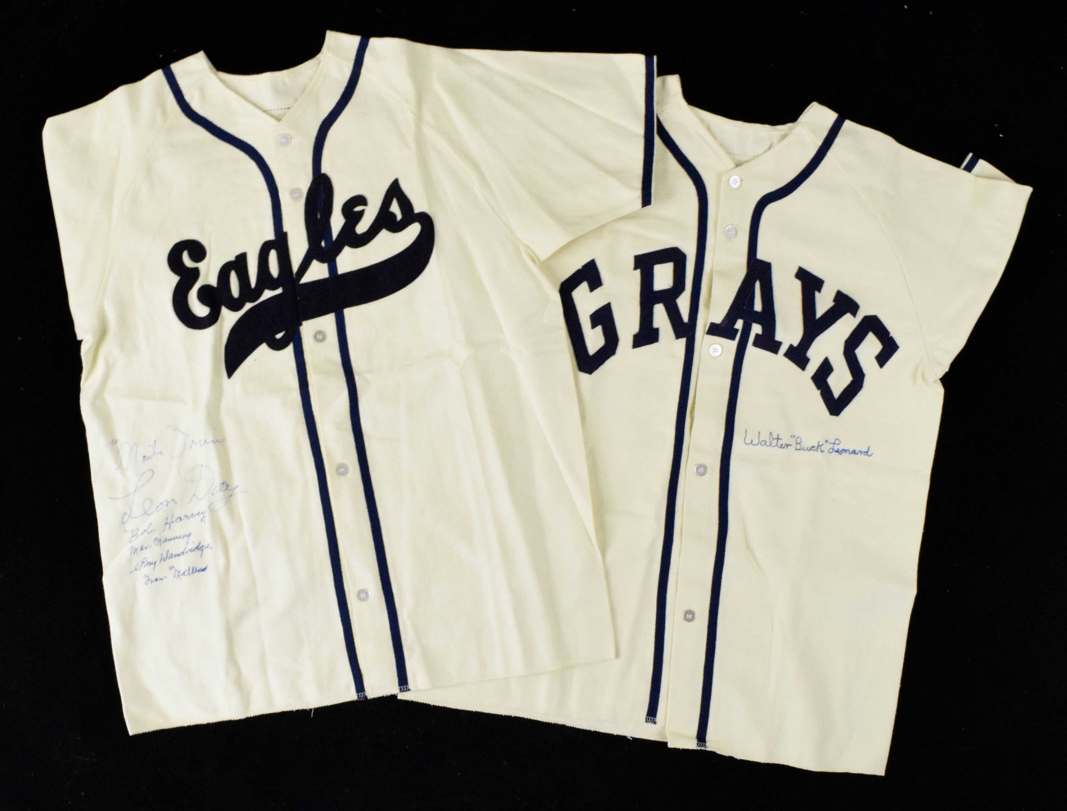 Description:Buck Leonard signed Homestead Grays jersey & multi-signed Newark Eagles jersey (NM-NM/MT). Includes an untagged Homestead Grays #32 Buck Leonard jersey signed by Leonard; and untagged Newark Eagles jersey signed by (6): Monte Irvin, Leon Day, Ray Dandridge, Max Manning, Bob Harvey, and Fran Matthews. Signatures rate 7 to 9 (avg 8) out of 10: NM-NM/MT