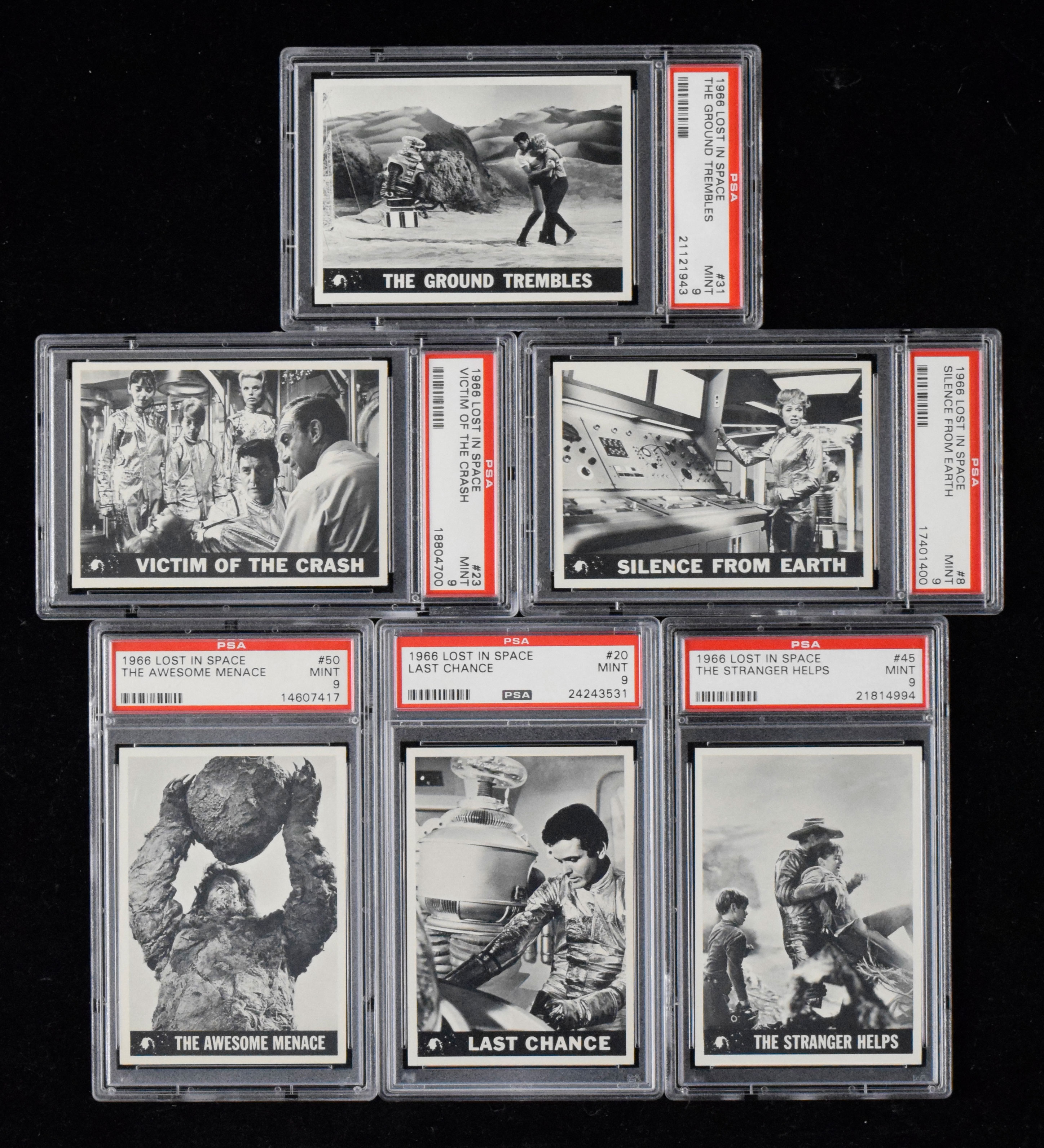 Lot of (69) high grade 1966 Lost In Space cards (plus 2 extras) (PSA NM-MT 8 to PSA Mint 9) Includes (9) PSA Mint 9 #8, 20, 23, 31, 38, 45, 46, 49, and 50; (60) PSA NM-MT 8 #1, 2, 3, 4, 5, 6, 7 (2), 8, 9, 10, 11, 12, 13, 14 (2), 16, 17, 18 (2), 19, 20, 21, 22 (2), 23, 24, 25 (2), 26 (2), 27, 30 (2), 31, 32, 33, 34, 35, 36 (2), 38, 40 (2), 41, 42, 43, 44, 45 (2), 46, 47, 48, 49, 51, 52, 53 (2), 54, and 55. Also includes PSA NM 7 #1 and PSA EX-MT 6 #55. Hint of light wear to a few cases: PSA NM-MT 8 to PSA Mint 9 ($1,500-$2,500)