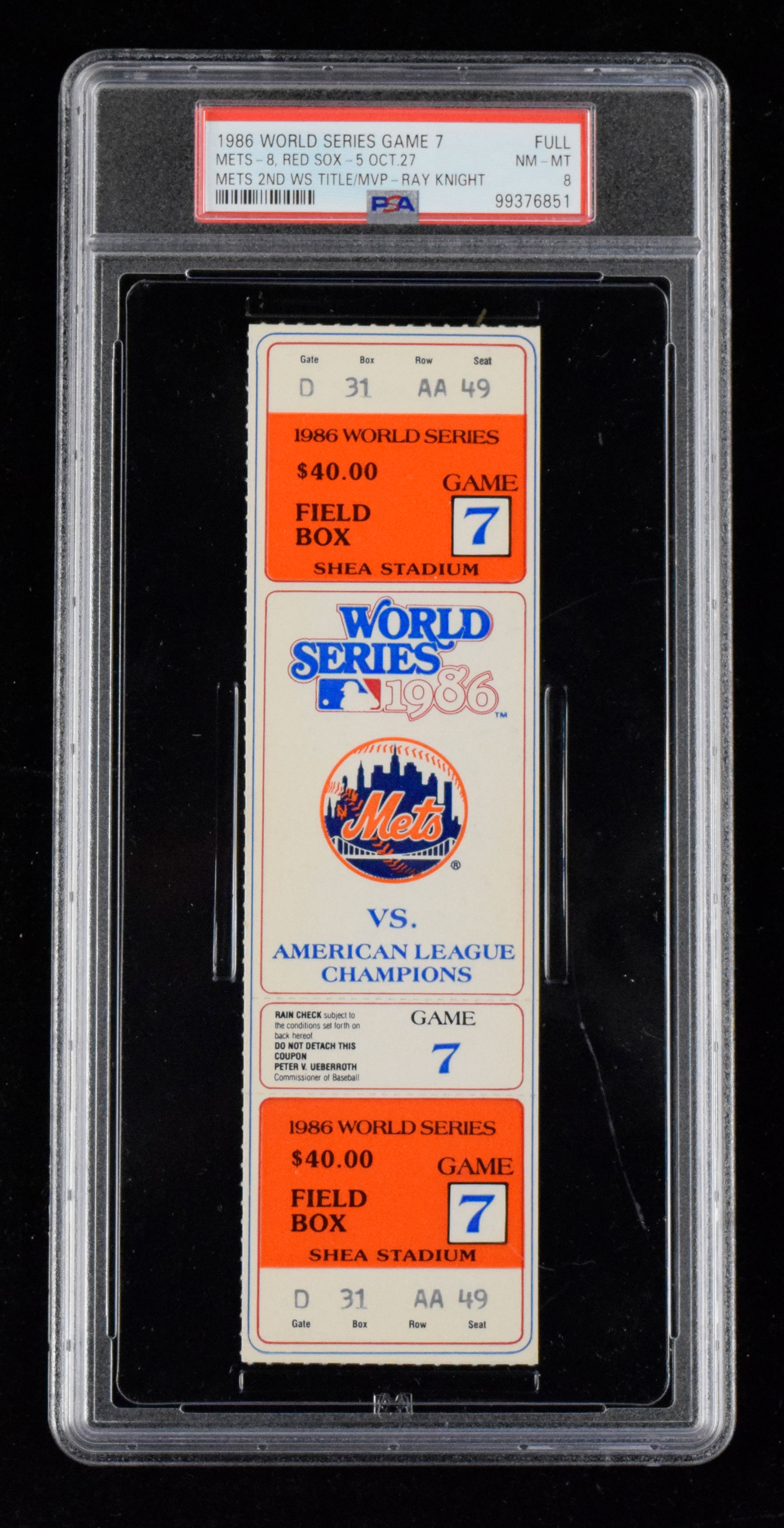 Description:1986 World Series Game (7) full ticket - Mets clinch Championship (PSA NM-MT) High grade full ticket issued for the game played at Shea Stadium showing no mentionable wear: PSA NM-MT 8 ($400-$600)
