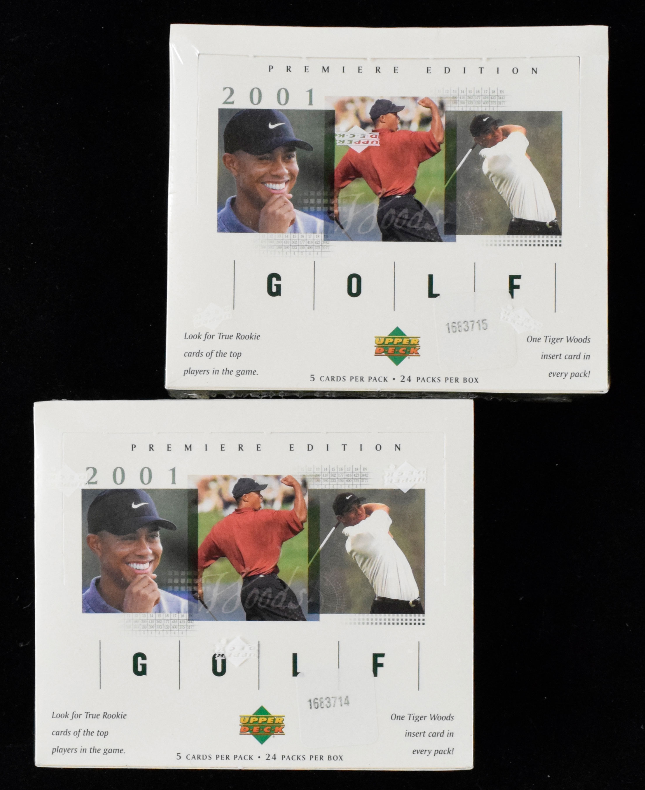 Description:Lot of (2) 2001 Upper Deck Golf factory-sealed hobby boxes, Tiger Woods RC possible (NM/MT). Each box has (24) unopened packs with a Tiger Woods insert card in every pack. Woods' rookie card is also possible in the packs. Both boxes remain in their original factory-sealed condition with no mentionable wear: NM/MT.