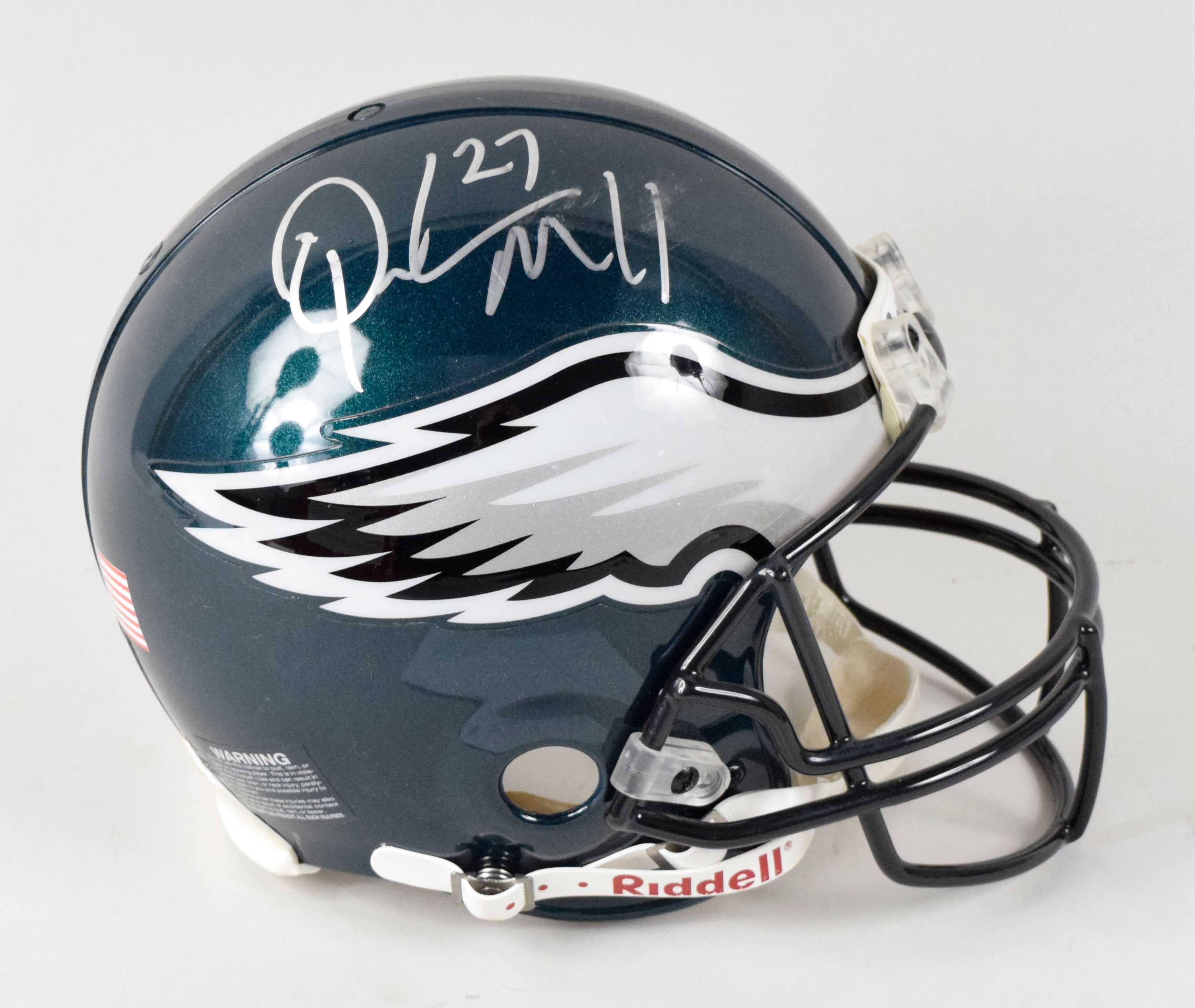 Description:Quintin Mikell autographed Philadelphia Eagles professional model helmet c. 2000s (EX/MT). Riddell VSR-4 model helmet has Eagles logo decals on either side. Player number "27" decals are on the back along with proper warning decal and a raised "NOC SAE" mark. Size "L" label inside. Mikell signed the shell in silver marker, rating 7 out of 10 with minor smudging. Helmet has evidence of very light (if any) use, mostly minor wear to the interior: EX/MT.