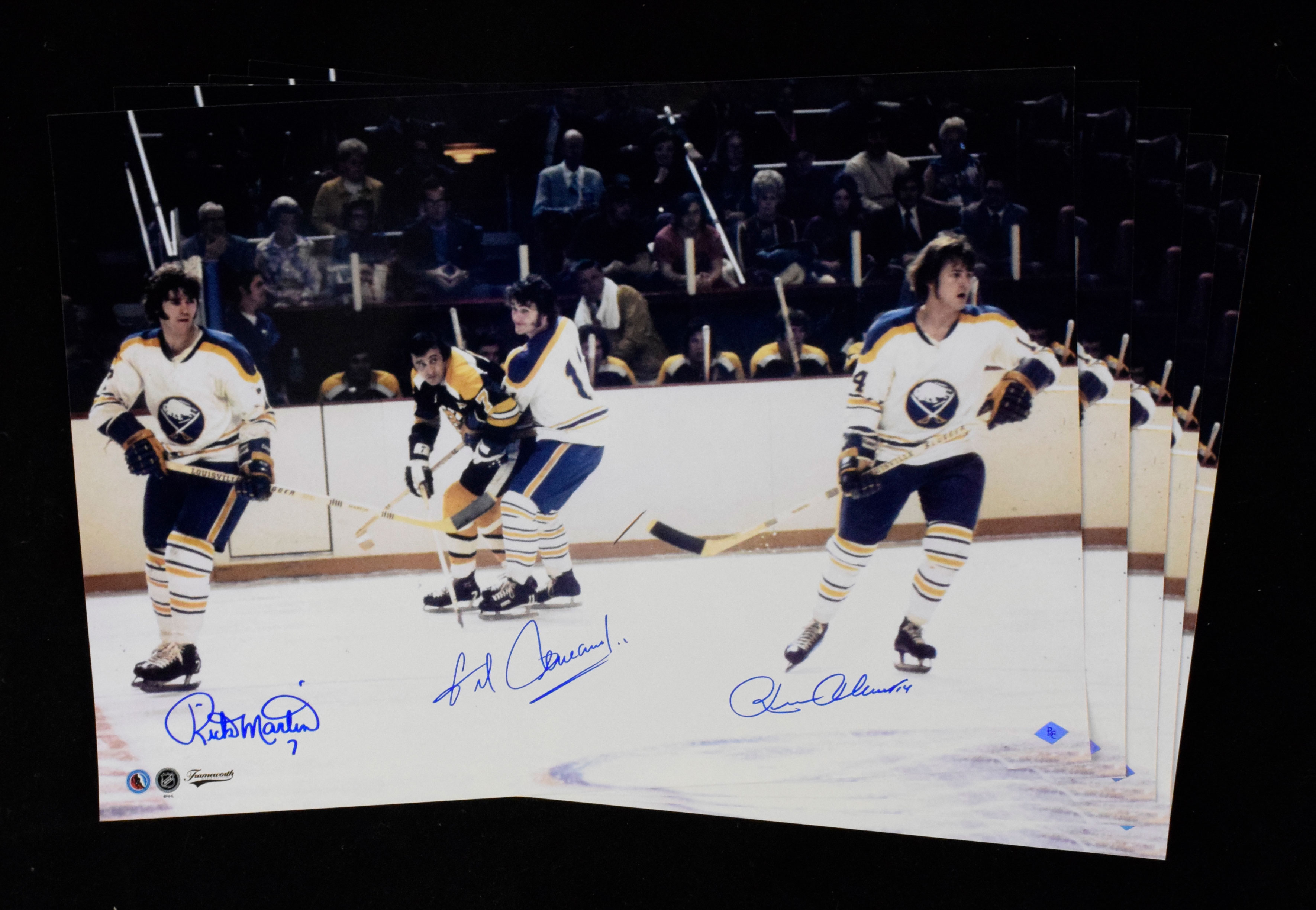 Description:Lot of (5) Buffalo Sabres French Connection autographed 16"x20" photos with BC certs (Sigs. MT). Outstanding lot of color photos, each signed in blue marker by the forward line that played for the Buffalo Sabres from 1972 until 1979: Hall of Famer Gilbert Perreault, along with Rick Martin and Rene Robert. Each has a BC Sports authentication sticker affixed to the front. Signatures rate 9/10 out of 10, and most photos are in like-new condition with each suitable for framing: NM-NM/MT.