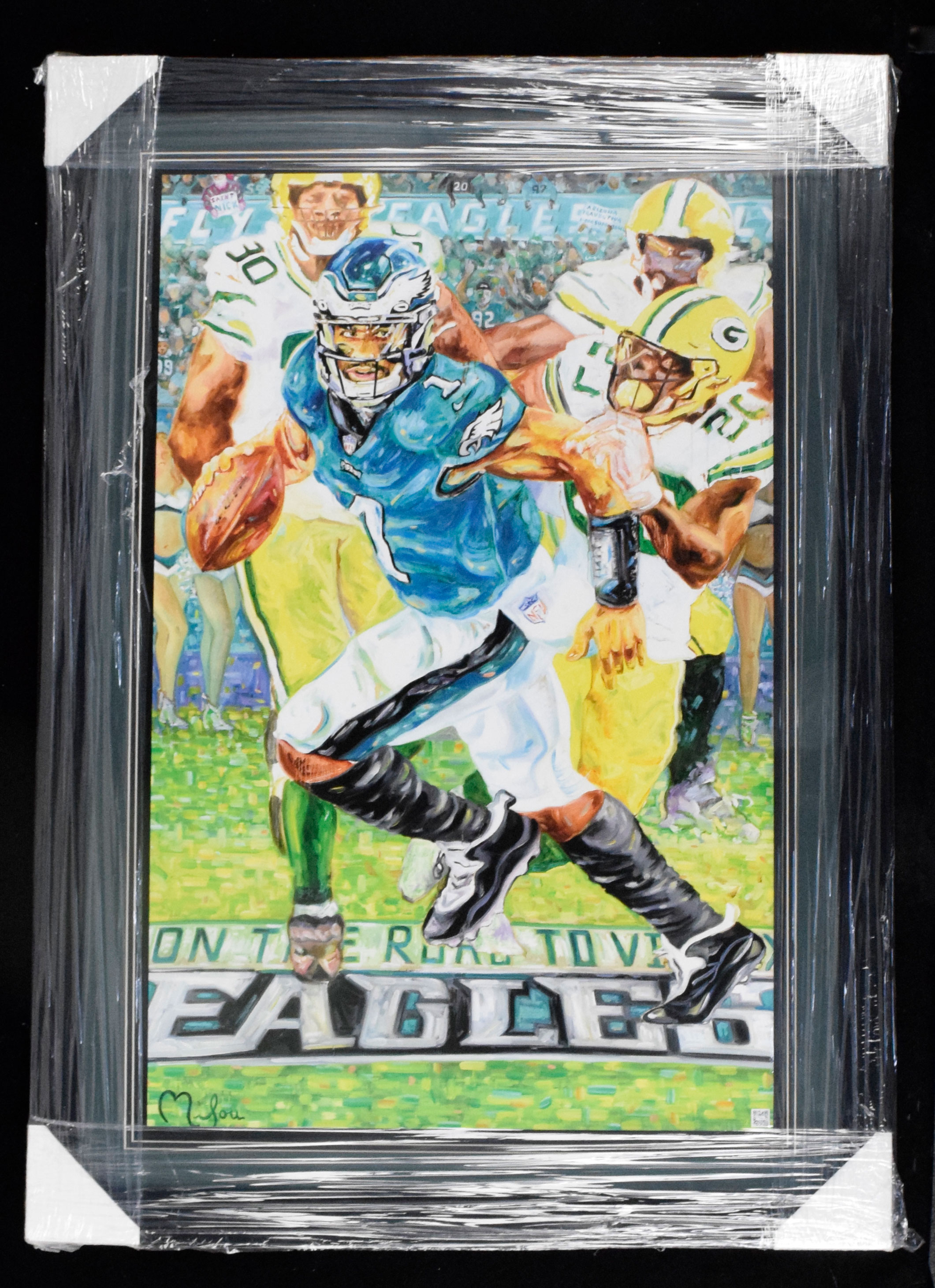 Description:Large framed and Jalen Hurts "On the Road to Victory" lithograph (NM). Beautifully framed and matted to approx. 42"x30," the print from Bristol artist Perry Milou depicts Hurts scrambling against the Green Bay Packers, eyes downfield. Piece would be at home in any Philadelphia-area mancave: NM/MT.