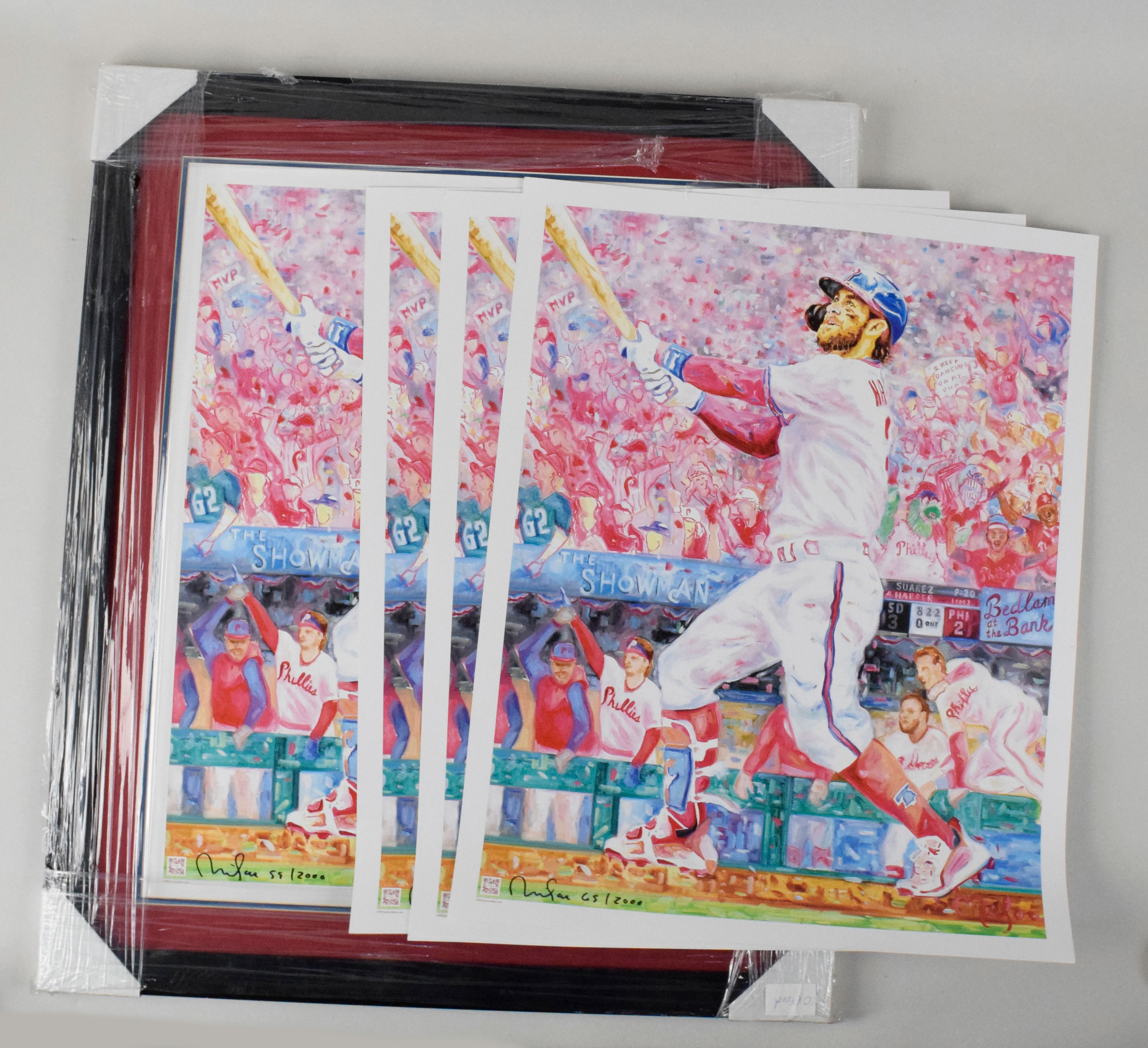 Description:Lot of (5) artist-signed Bryce Harper "Bedlam at the Bank" 24"x30" lithographs, #'d to 2000 (EX/MT-NM). Each lithograph depicts Harper's iconic home run in Game 5 of the 2022 NLCS and the famous "Bedlam at the Bank" call from radio announcer Scott Franzke. Each has been signed in black marker by Bristol artist Perry Milou and numbered to 2,000, with signatures rating 9 out of 10. Four of the lithographs are unframed, while one is framed but is missing its glass on the front: EX/MT-NM.