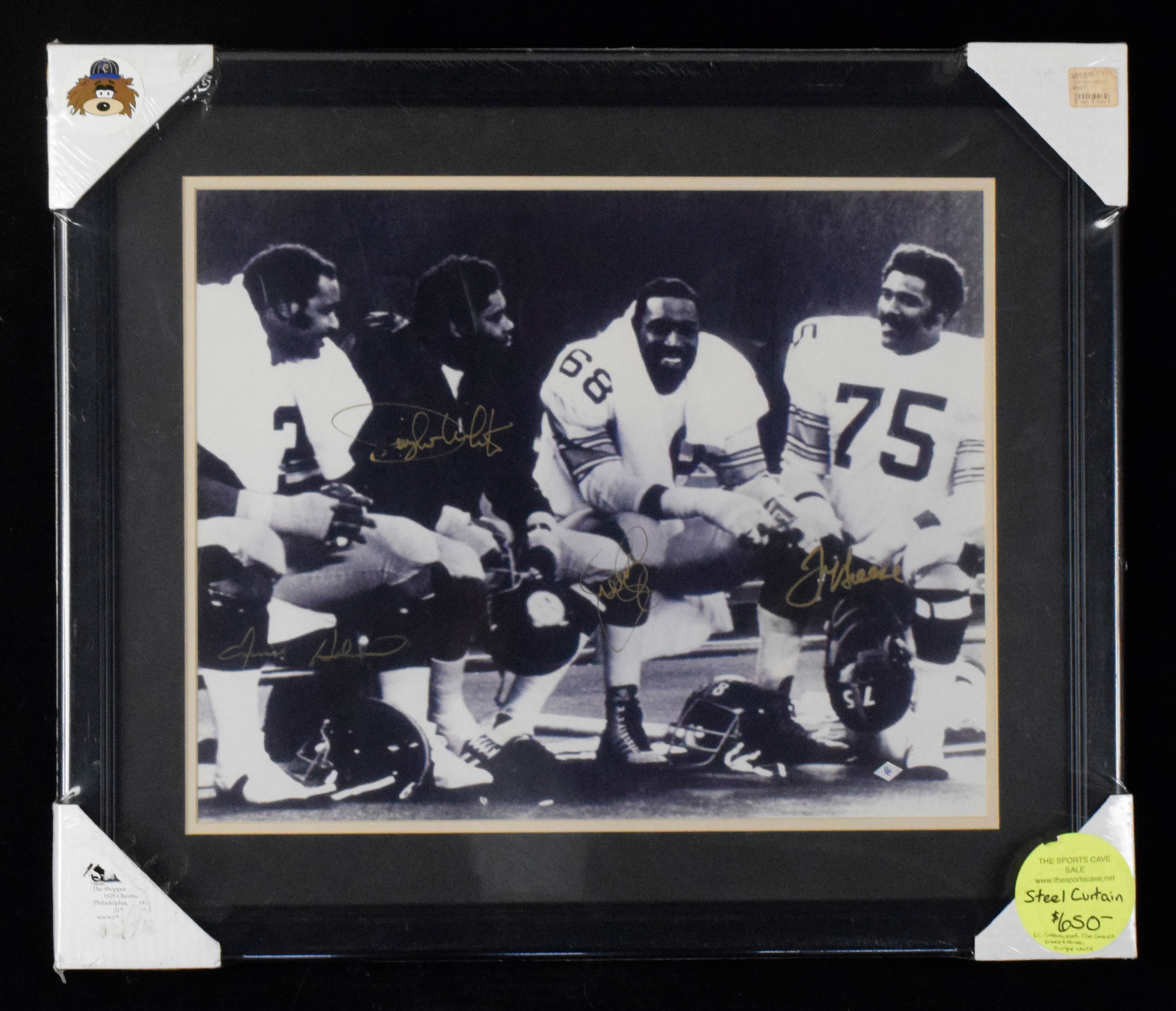 Description:Large Pittsburgh Steelers Steel Curtain framed and autographed photo with BC Sports cert (Sigs. NM-MT). Outstanding photo of the famed Steelers defensive line has been signed by its four members: L.C. Greenwood, Joe Greene, Ernie Holmes and Dwight White (small smudge to signature). A BC Sports authentication sticker is affixed to the bottom right, and a BC Sports letter is also on the reverse. Signatures range from 7 (White) to 9 out of 10. Frame, measuring approx. 22"x26," was originally packaged for retail sale, and exhibits little to no wear: NM/MT.