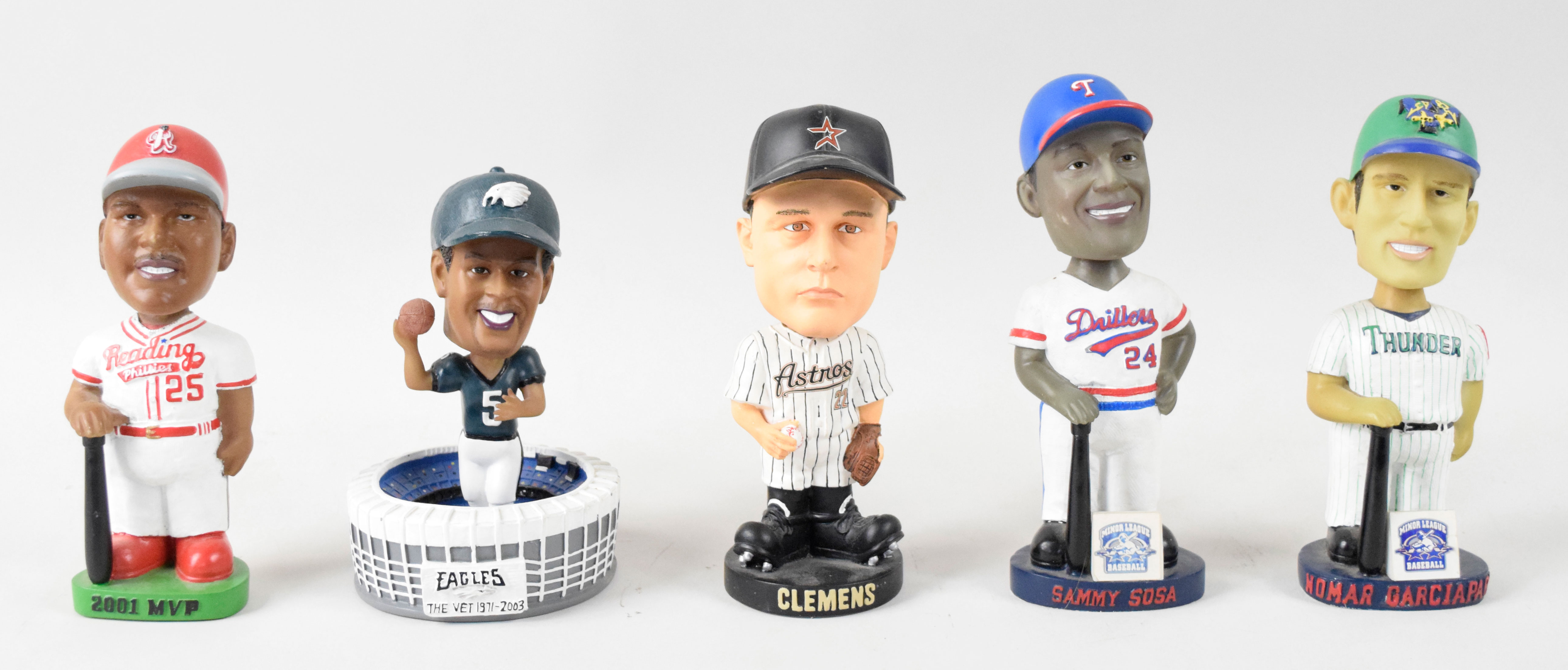 Description:Lot of (11) mostly modern stadium giveaway nodders, including one autographed (EX/MT-MT). Includes mostly stadium giveaway bobbleheads with one retail (Roger Clemens). Other figures included are Charlie Wagner, Joe Roa, (2) diff. Donovan McNabb, (2) diff. Gavin Floyd, Jeff Manto, Nomar Garciaparra, Marlon Byrd (autographed on helmet, rating 8 out of 10) and Sammy Sosa. Nodders (not in boxes) have light to no wear: EX/MT-MT.