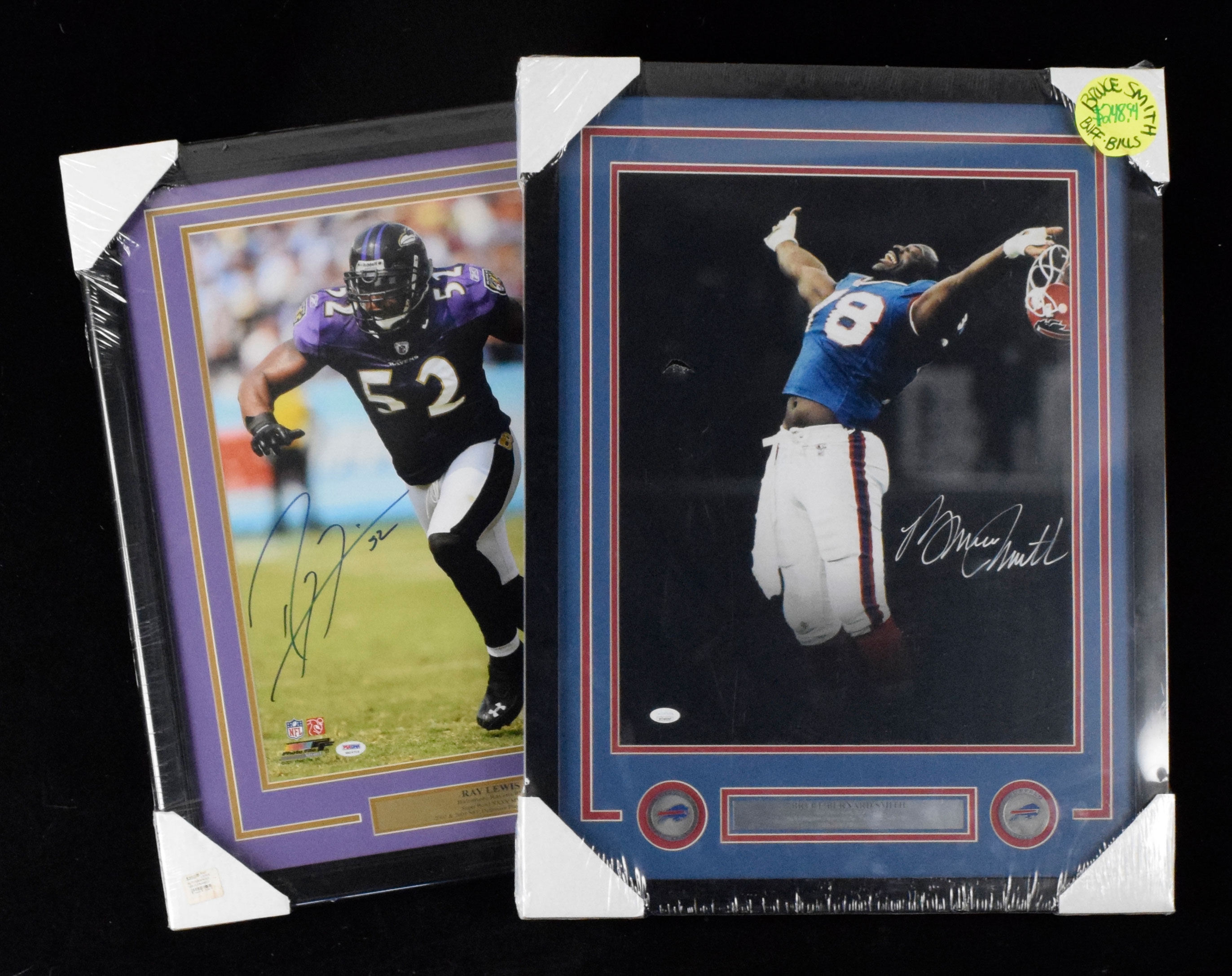 Description:Lot of (2) large NFL HOFer framed and autographed photos, with Bruce Smith and Ray Lewis (Sigs. NM/MT). Outstanding lot professionally framed and matted photos autographed by two dominating defensive players. Includes (1) photo framed to 22"x26" of Ray Lewis, signed by Lewis in blue marker and with PSA/DNA authentication sticker and basic cert and (1) photo framed to 22"x29" of Bruce Smith, signed by Smith in white marker and with JSA authentication sticker and basic cert. Signatures rate 8 out of 10 and frames, originally packaged for retail sale, exhibit little to no wear: NM/MT.