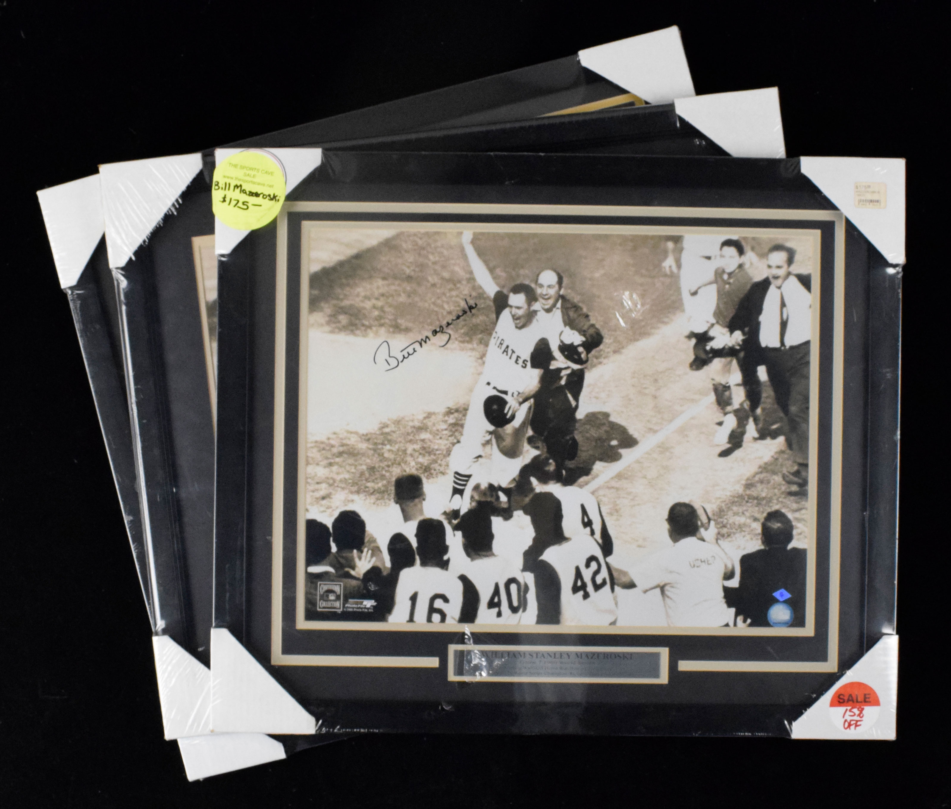 Description:Lot of (3) large Bill Mazeroski framed and autographed photos, with BC Sports auth. (Sigs. MT). Each photo of Mazeroski rounding the bases following his famous walk-off home run in Game 7 of the 1960 World Series has been signed by Mazeroski in black marker, rating 9 out of 10. Each has been professionally framed and matted to approx. 22"x26," and has a BC Sports authentication sticker and basic cert. Frames, originally packaged for retail sale, exhibit little to no wear: NM/MT.