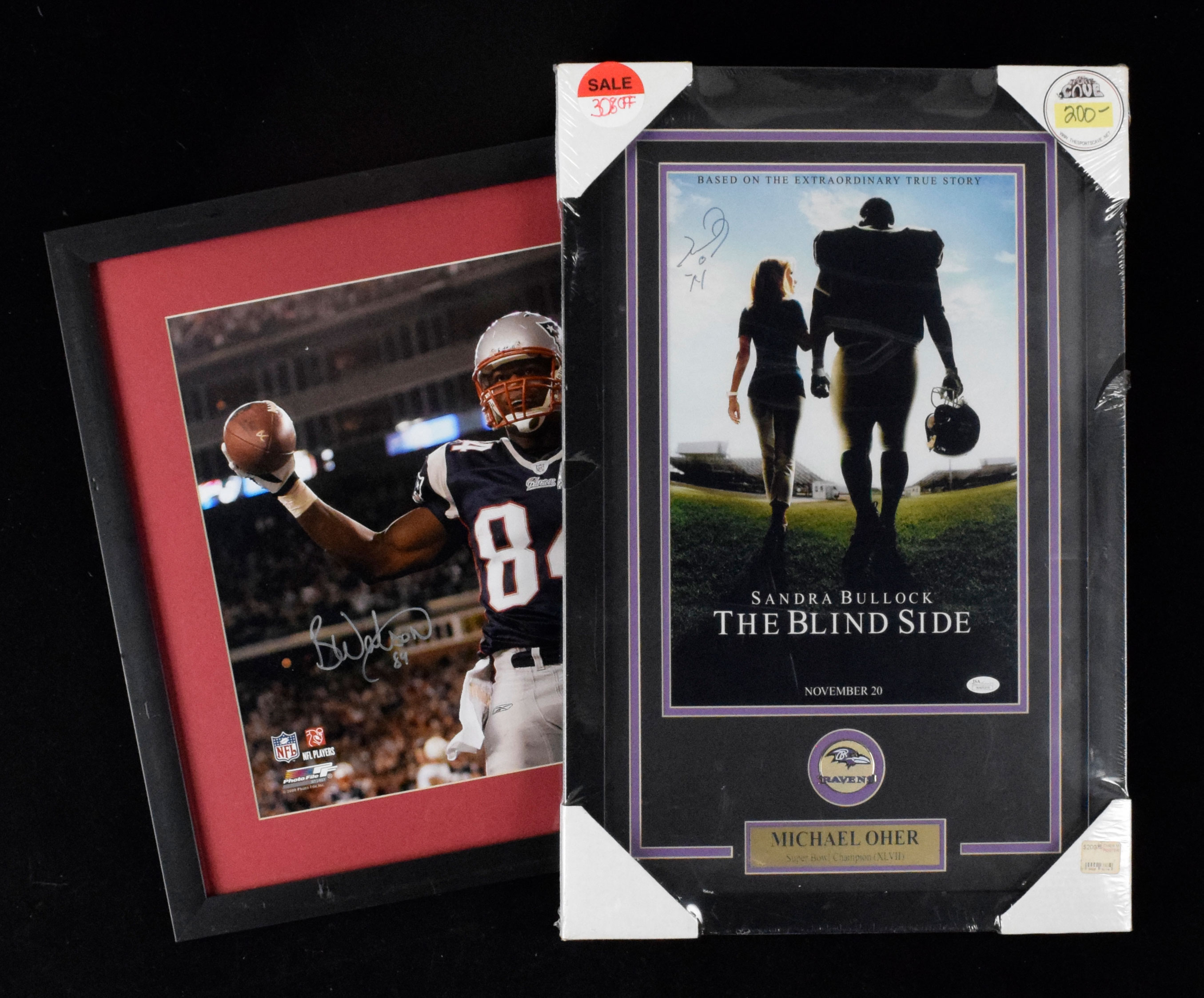 Description:Lot of (3) NFL player framed and autographed photos, including Willie Parker, Michael Oher (Sigs. NM/MT-MT). Excellent lot professionally framed and matted NFL player photos with (1) movie poster photo of the Blind Side framed to 17"x26" and signed by Michael Oher with JSA authentication sticker and basic cert; (1) photo of Willie Parker framed to 24"x26" and signed by Parker with BC Sports authentication sticker and basic cert; and (1) photo of Ben Watson framed to 22"x26" and signed by Watson with BC Sports authentication sticker and basic cert. Signatures rate 8/9 out of 10 and frames, originally packaged for retail sale, exhibit light to little wear: EX/MT-MT.