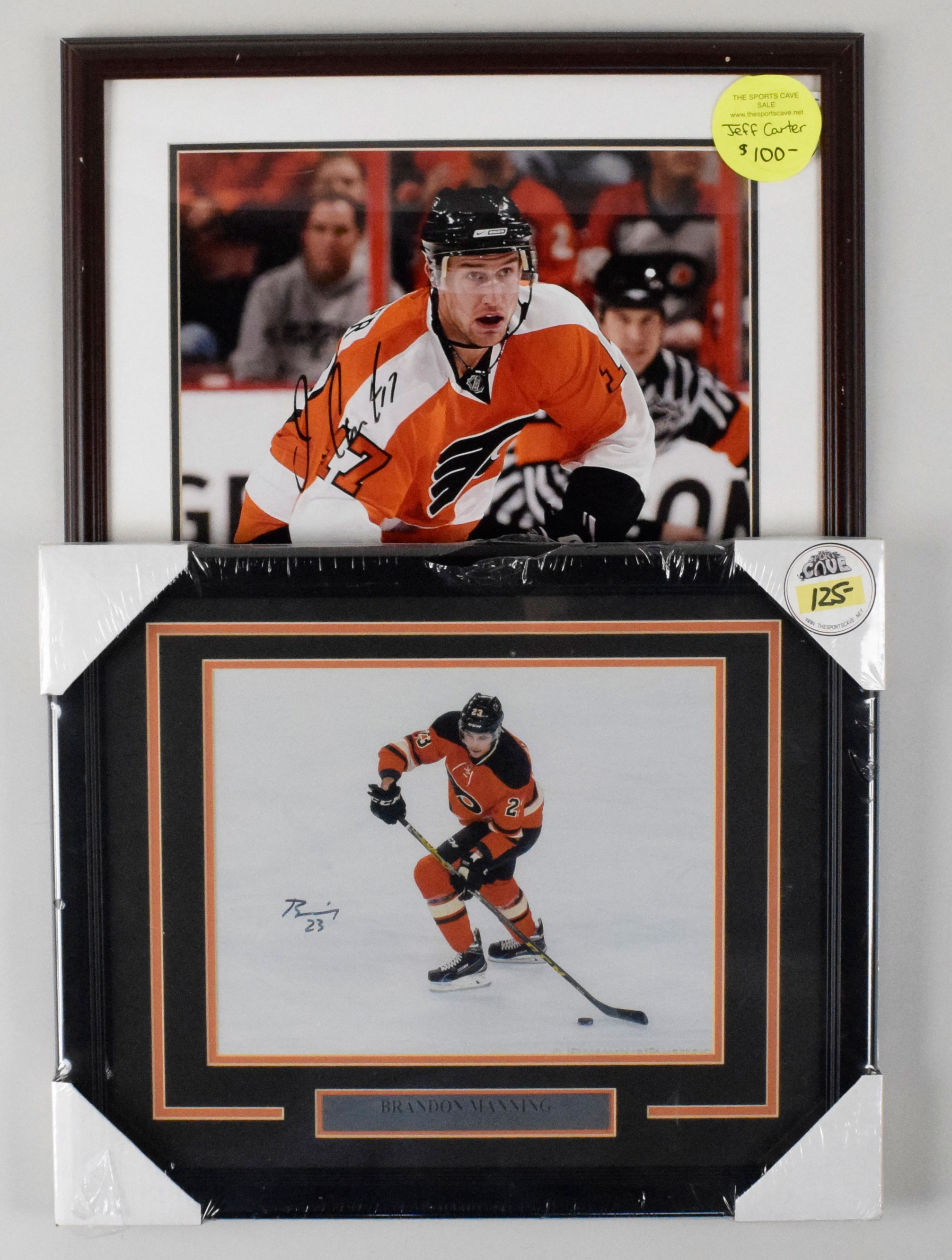 Description:Lot (10) hockey signed and unsigned photos, including several framed items (Sigs. NM/MT-MT). Includes (1) photo of Max Talbot framed to 16"x16" and signed by Talbot with "09 SC Champ" inscription; (1) unsigned Ed Snyder lithograph framed to 18"x20"; (1) photo of Brandon Manning framed to 18"x22" signed by Manning; (1) photo of Jeff Carter framed to 22"x26" signed by Carter with BC Sports authentication sticker and basic cert and (6) 8"x10" matted photos, individually signed by Braydon Coburn, (2) Riley Cote, Arron Asham, Justin Williams, and Jared Ross (each with Mancave authentication stickers and basic certs). Signatures rate 8/9 out of 10 and items range EX-NM/MT.
