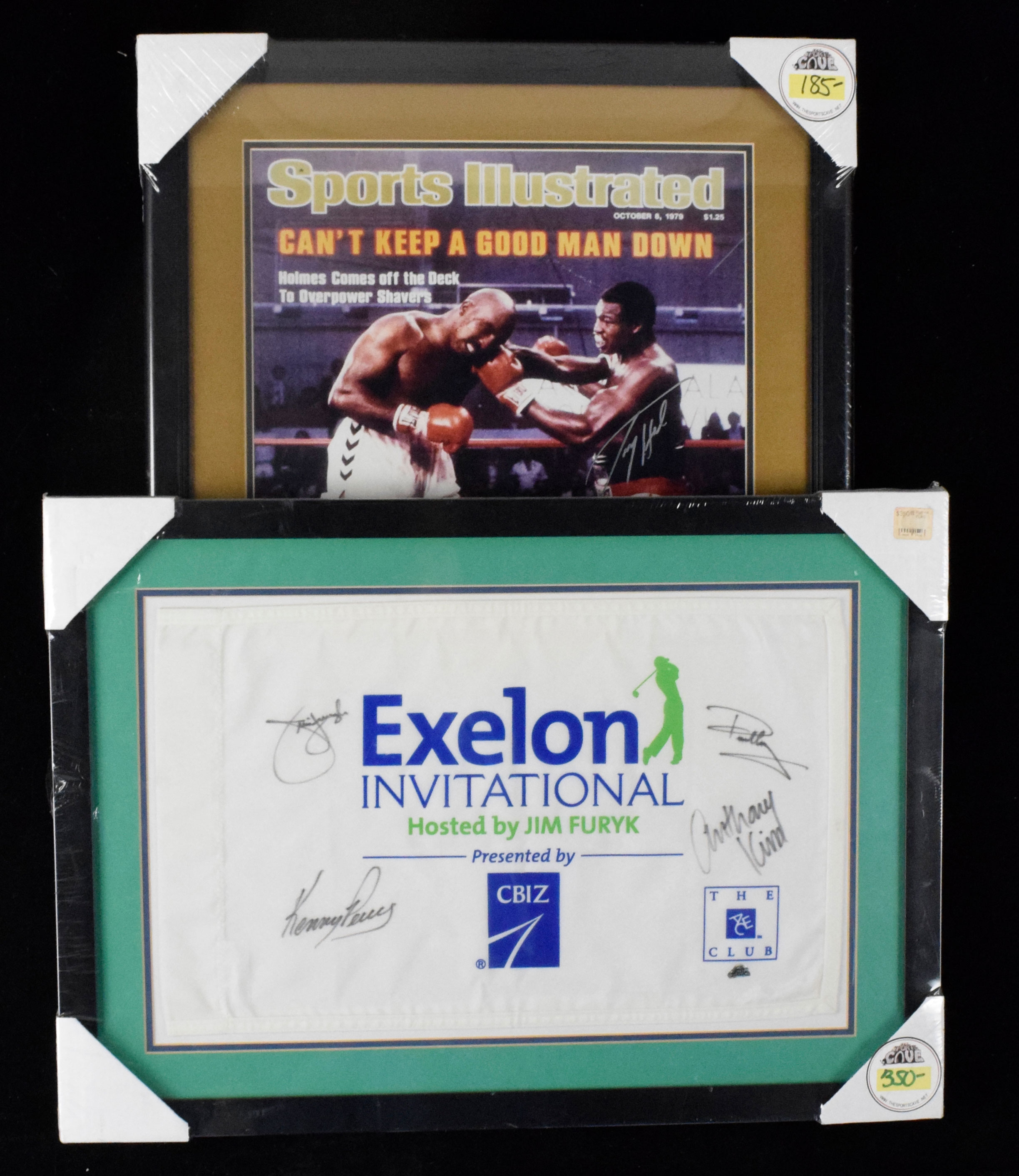 Description:Lot of (2) framed and autographed golf and boxing items, including Larry Holmes, Jim Furyk (Sigs. NM/MT). Includes (1) Exelon Invitational pin flag framed to 20"x28" and signed by Jim Furyk, Kenny Perry, Paul Casey and Anthony Kim with Mancave authentication sticker and (1) photo of Larry Holmes framed to 22"x27 signed by Holmes with BC authentication sticker and basic cert. Signatures rate 8 out of 10 and frames, originally packaged for retail sale, exhibit little to no wear: NM/MT.