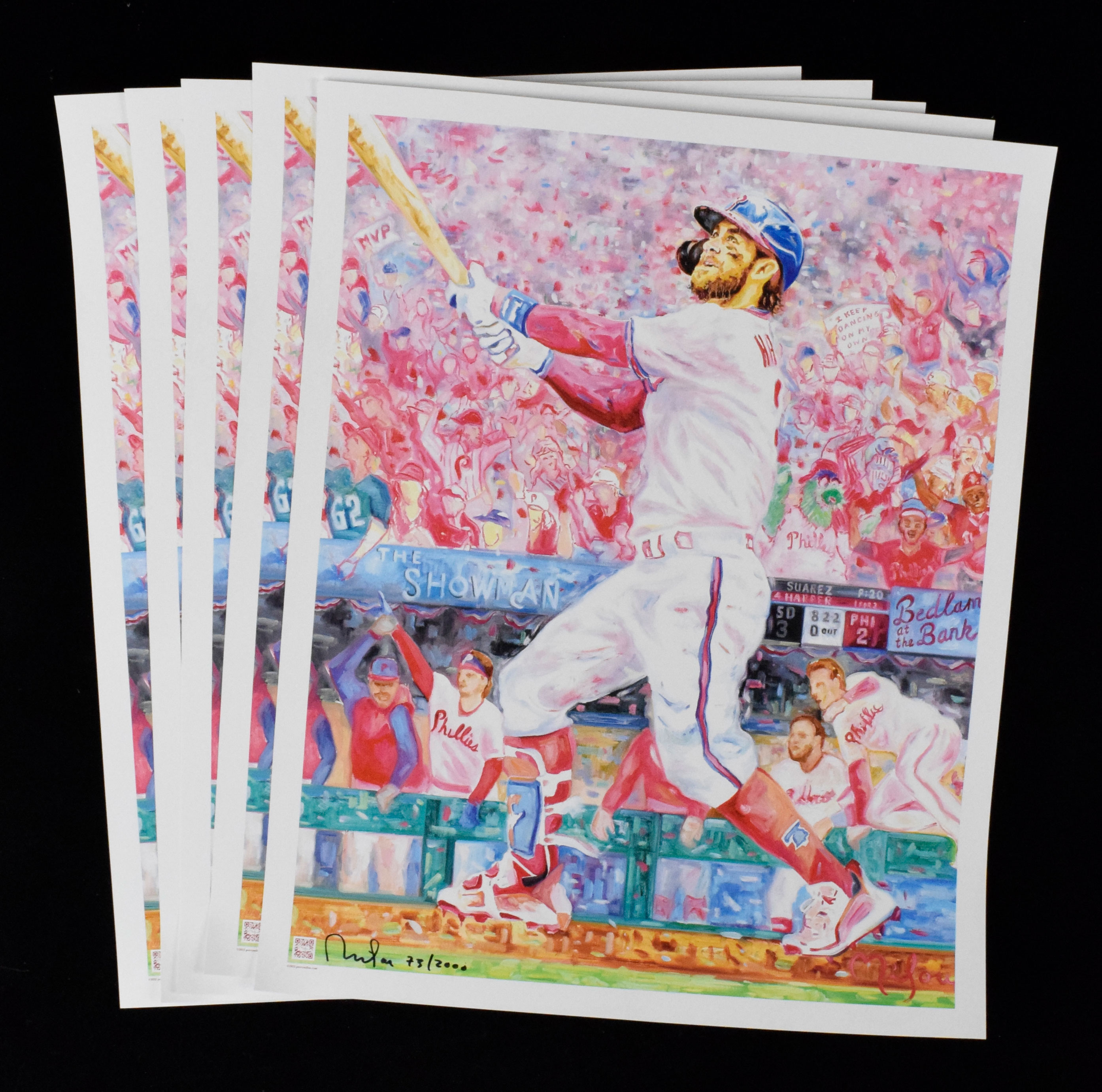Description:Lot of (5) artist-signed Bryce Harper "Bedlam at the Bank" 24"x30" lithographs, #'d to 2000 (NM-NM/MT). Each lithograph (rolled) depicts Harper's iconic home run in Game 5 of the 2022 NLCS and the famous "Bedlam at the Bank" call from radio announcer Scott Franzke. Each has been signed in black marker by Bristol artist Perry Milou and numbered to 2,000, with signatures rating 9 out of 10. Lithos (suitable for framing) exhibit little to no wear: NM-NM/MT.