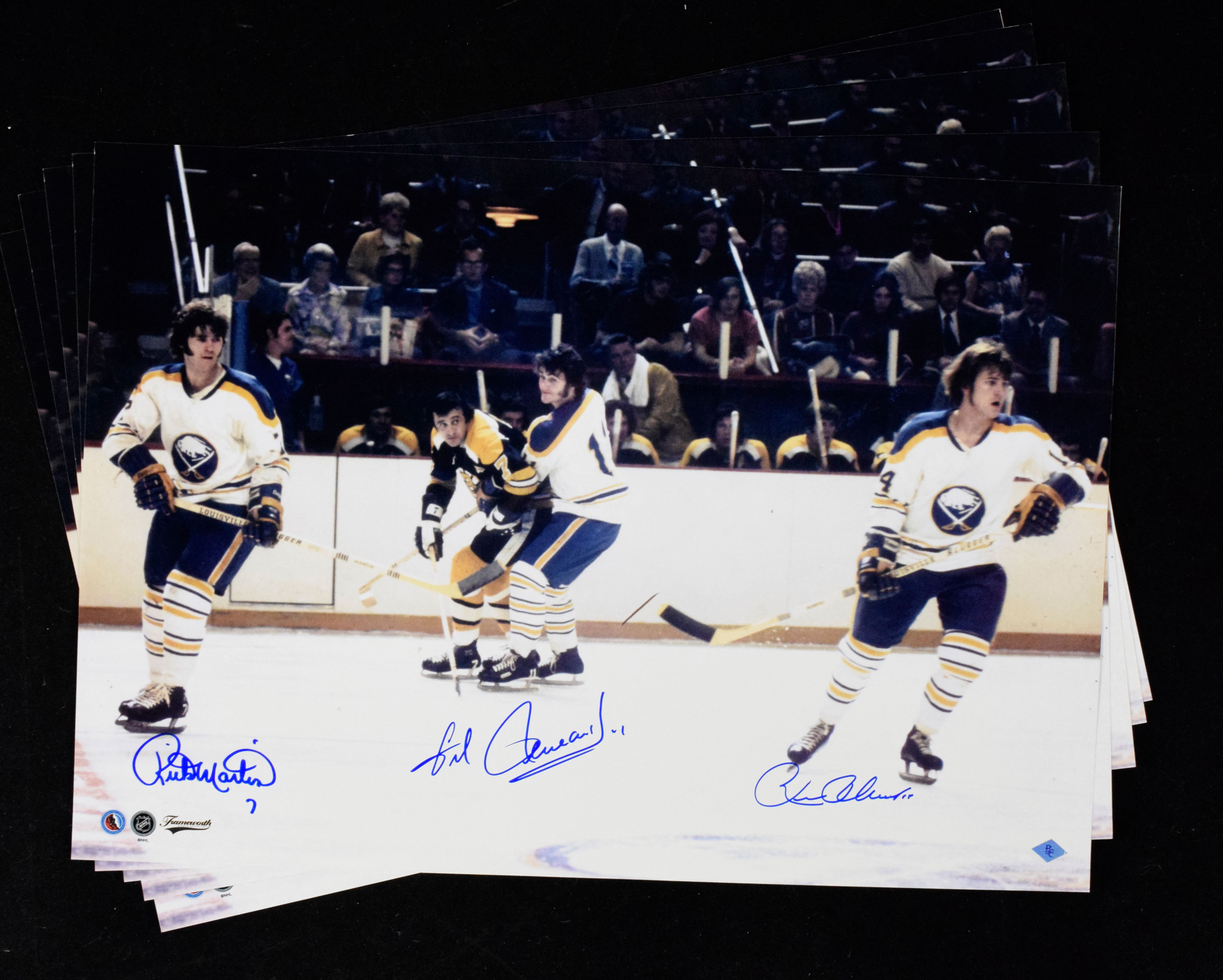 Description:Lot of (5) Buffalo Sabres French Connection autographed 16"x20" photos with BC certs (Sigs. MT). Outstanding lot of color photos, each signed in blue marker by the forward line that played for the Buffalo Sabres from 1972 until 1979: Hall of Famer Gilbert Perreault, along with Rick Martin and Rene Robert. Each has a BC Sports authentication sticker affixed to the front. Signatures rate 9/10 out of 10, and most photos are in like-new condition with each suitable for framing: NM-NM/MT.