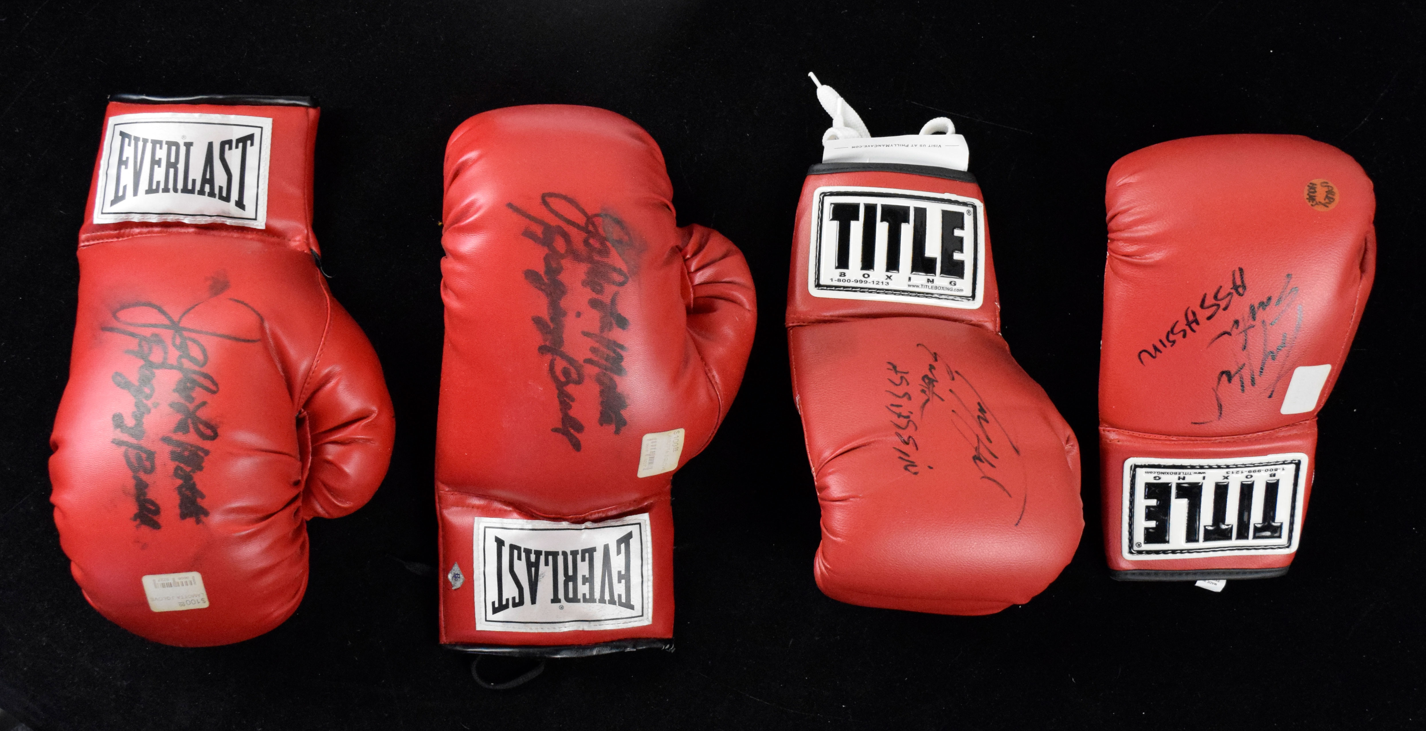 Description:Lot of (4) autographed boxing gloves, with Larry Holmes and Jake LaMotta (Sigs VG/EX-NM). Includes (2) Title gloves individually signed by Larry Holmes, each with "Easton Assassin" inscriptions, rating 7/8 out of 10 and (2) Everlast gloves individually signed by Jake LaMotta, each with "Raging Bull" inscriptions, rating 4/5 out of 10 due to moderate to heavy smudging of the signatures. Gloves, with retail price stickers affixed, exhibit little wear: EX/MT-NM.