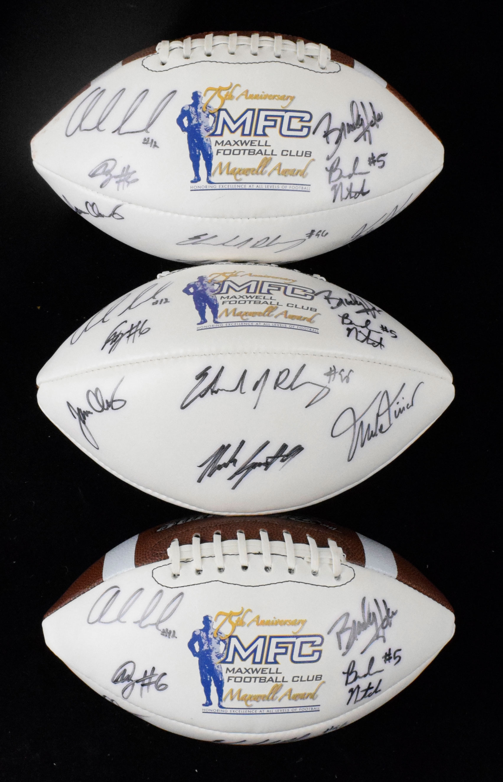 Description:Lot of (3) multi-signed Maxwell Football Club footballs, including Andrew Luck, Archie Manning (Sigs. NM). Each The Big Game Maxwell Football Club 75th Anniversary logo ball has been signed by (12), including Andrew Luck, Archie Manning, Mike McCarthy, Tyrann Mathieu, Mike Tirico and others. Signatures (some with slight ink bleed), rate 7 out of 10. Balls are partially deflated and it is unknown if they will hold additional air: EX.