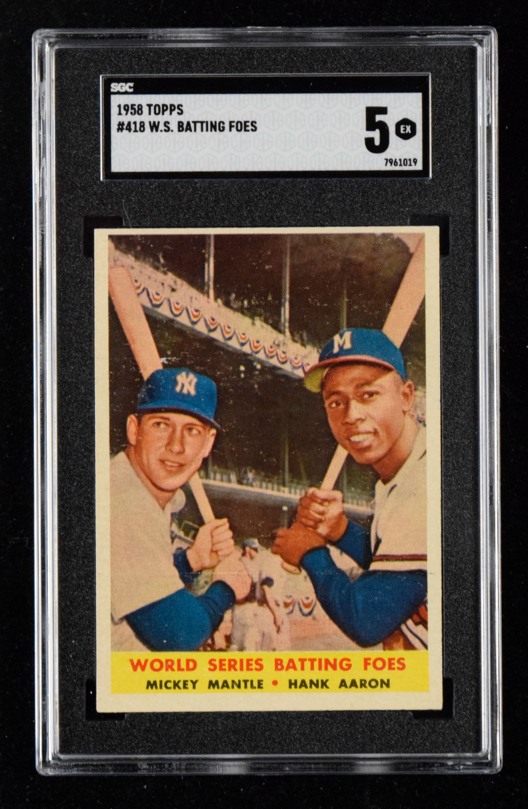 Description:1958 Topps #418 World Series Batting Foes with Mickey Mantle & Hank Aaron (SGC 5 EX). Classic card featuring the two Hall of Famers is centered to the top with light corner wear. Back is also off-center but otherwise clean: SGC 5 EX.