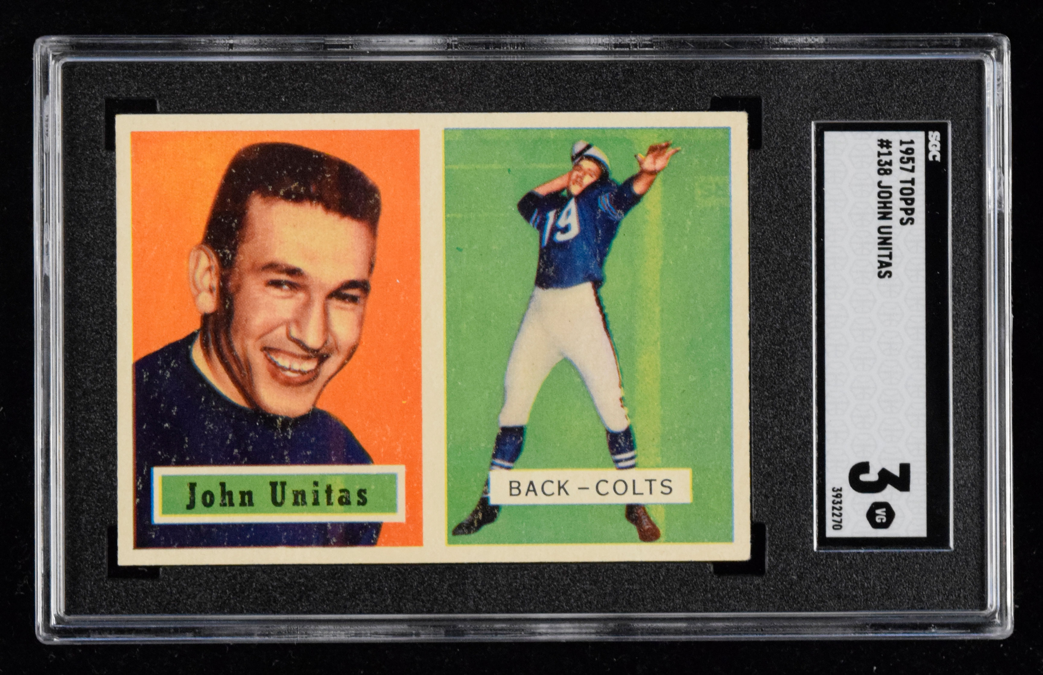 Description:1957 Topps #128 Johnny Unitas RC (SGC 3 VG). Key rookie card from the 1957 Topps football set is nicely centered with some "snow" print defects visible in the dark portions of the card. Card has light corner wear and a clean back: SGC 3 VG.