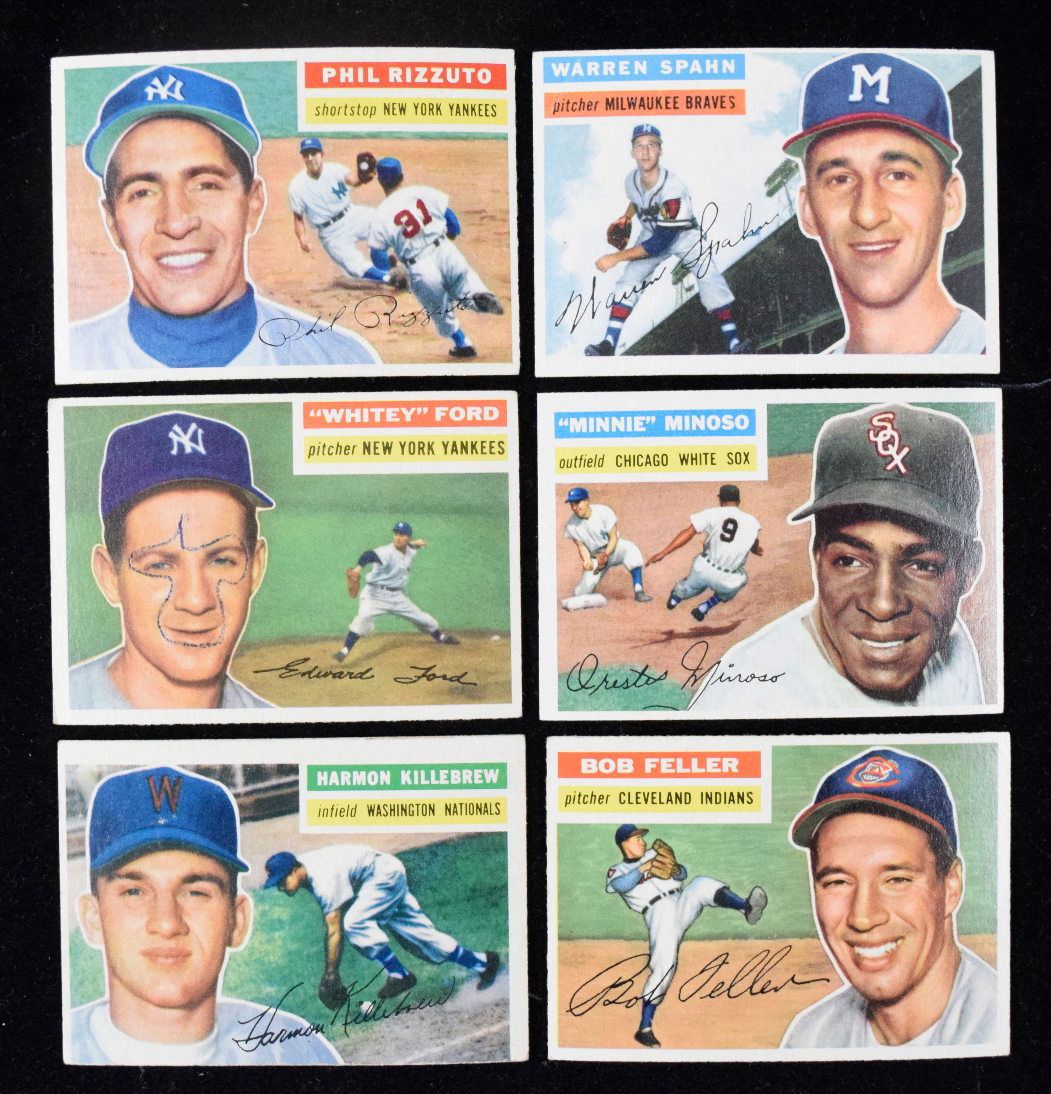 Description:Lot of (11) 1956 Topps HOFers, including Rizzuto, Feller and Spahn (PR-EX). High-value lot of Hall of Famers from the 1956 Topps set, with #s 200 Bob Feller (VG/EX), (2) 125 Minnie Minoso gray back (both EX), (2) 118 Nellie Fox gray back (VG & VG/EX); 164 Harmon Killebrew gray back (PR; miscut and ink writing on reverse), 113 Phil Rizzuto gray back (EX), 107 Eddie Mathews gray back (PR), 240 Whitey Ford (PR; ink writing on Ford's face), 109 Enos Slaughter gray back (VG/EX) and 10 Warren Spahn white back (GD). Range: PR-EX.