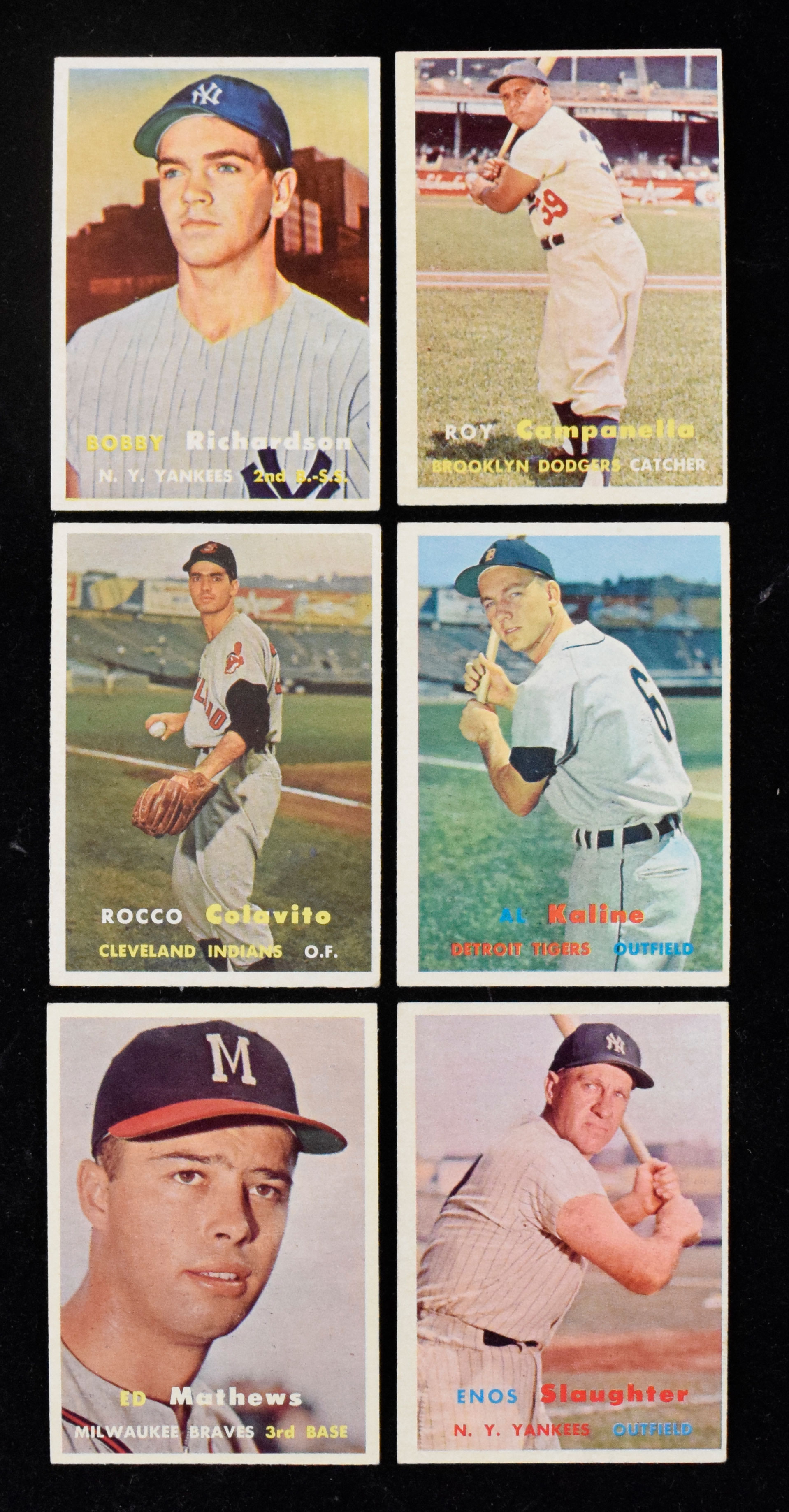 Description:Lot of (6) 1957 Topps stars and RCs, including Richardson RC, Campanella and Kaline (VG-EX). Nice lot of star cards from the 1957 Topps set, with #s 286 Bobby Richardson RC (EX), 210 Roy Campanella (EX OC), 125 Al Kaline (VG), 215 Enos Slaughter (VG/EX OC), 212 Rocky Colavito RC (VG) and 250 Eddie Mathews (EX). Range: VG-EX.