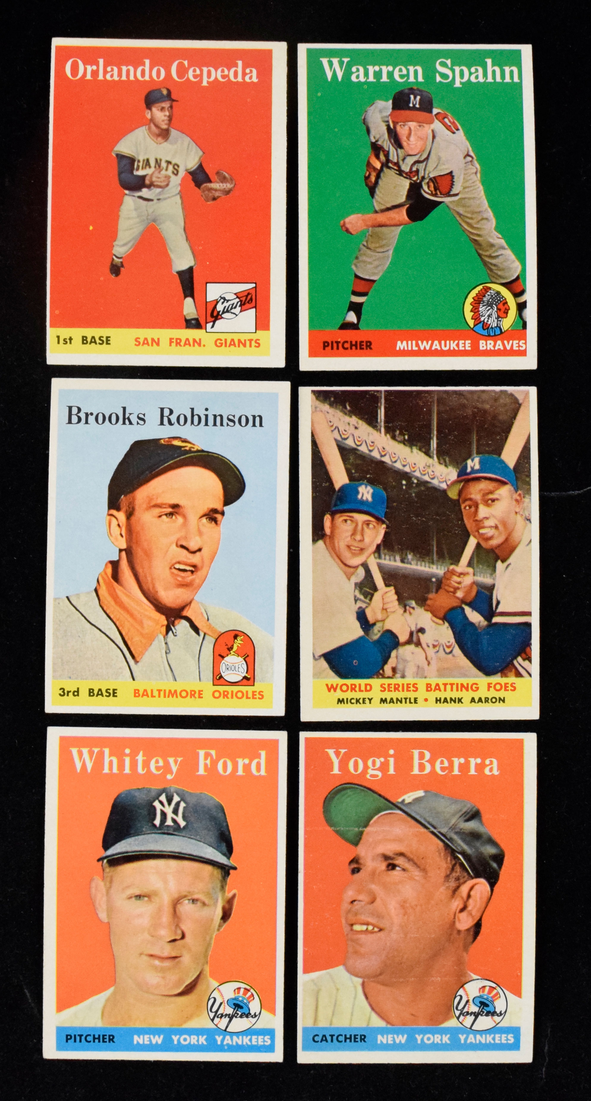 Lot of (6) 1958 Topps HOFers, with Cepeda RC, Mantle/Aaron and Berra (VG-EX/MT). High-value lot of key cards from the 1958 Topps set, with #s 419 Mickey Mantle/Hank Aaron (VG OC), 270 Warren Spahn (EX), 343 Orlando Cepeda RC (EX OC), 320 Whitey Ford (VG), 307 Brooks Robinson (EX/MT) and 370 Yogi Berra (VG/EX OC). Range: VG-EX/MT.
