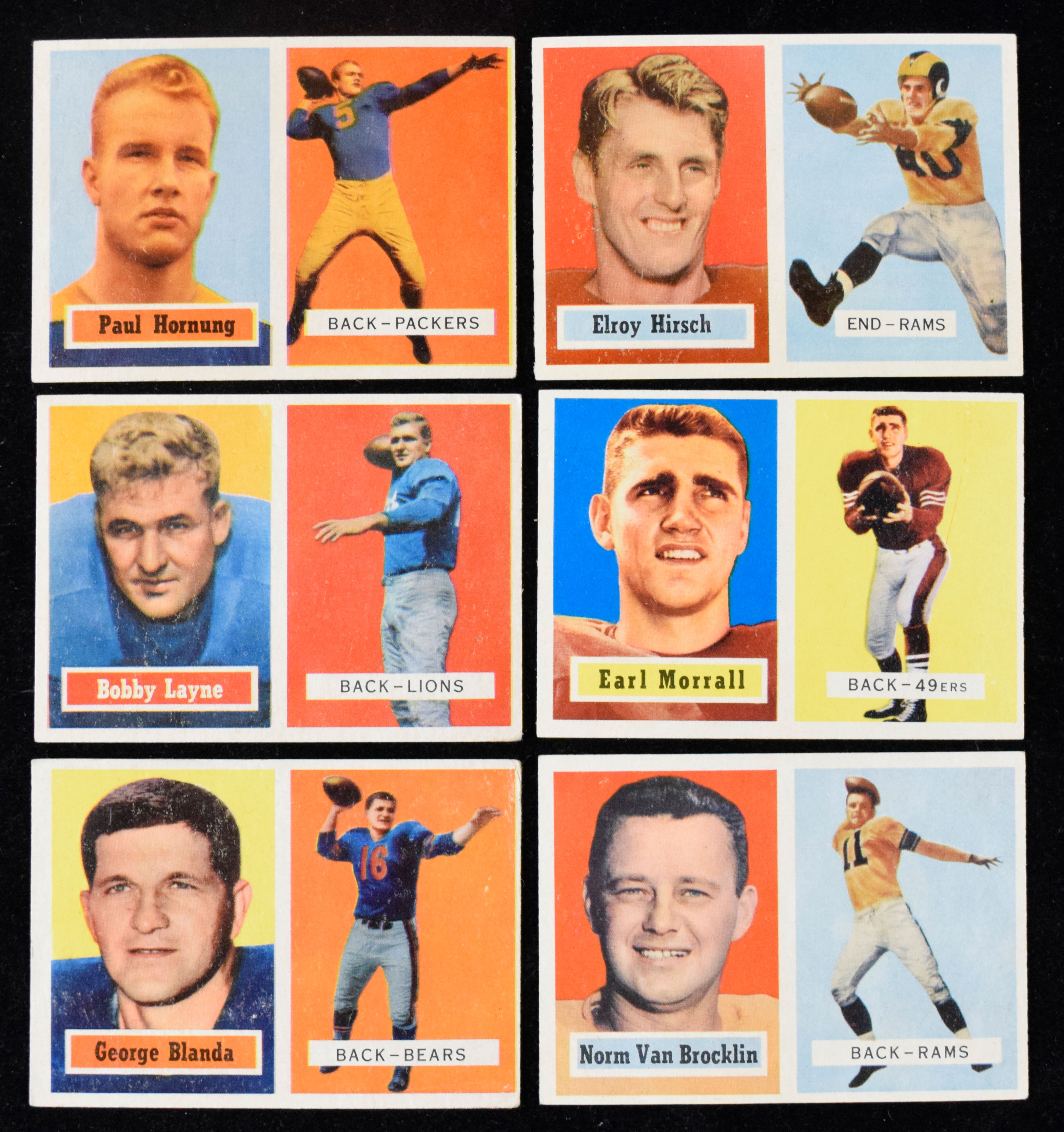 Description:1957 Topps Football partial set (69/155) with Hornung RC, Blanda & Van Brocklin (PR-EX/MT). Lot offers an excellent start on a 1957 Topps Football set, with (69) different cards spanning both series out of the 155 issued. Lot includes several notable stars and RCs, such as #s 22 Norm Van Brocklin (EX), 31 George Blanda (FR), 32 Bobby Layne (GD), 46 Elroy Hirsch (EX/MT), 49 Chuck Bednarik (GD), 68 Yale Lary (VG/EX), 71 Andy Robustelli (VG/EX OC), 85 Dick Lane RC (VG/EX; wax stain on reverse), 104 Earl Morrall RC (EX/MT OC), 124 Tommy McDonald RC (GD) and 151 Paul Hornung RC (VG/EX). Balance of the lot appears mostly VG-VG/EX with some better and some worse. Range: PR-EX/MT.