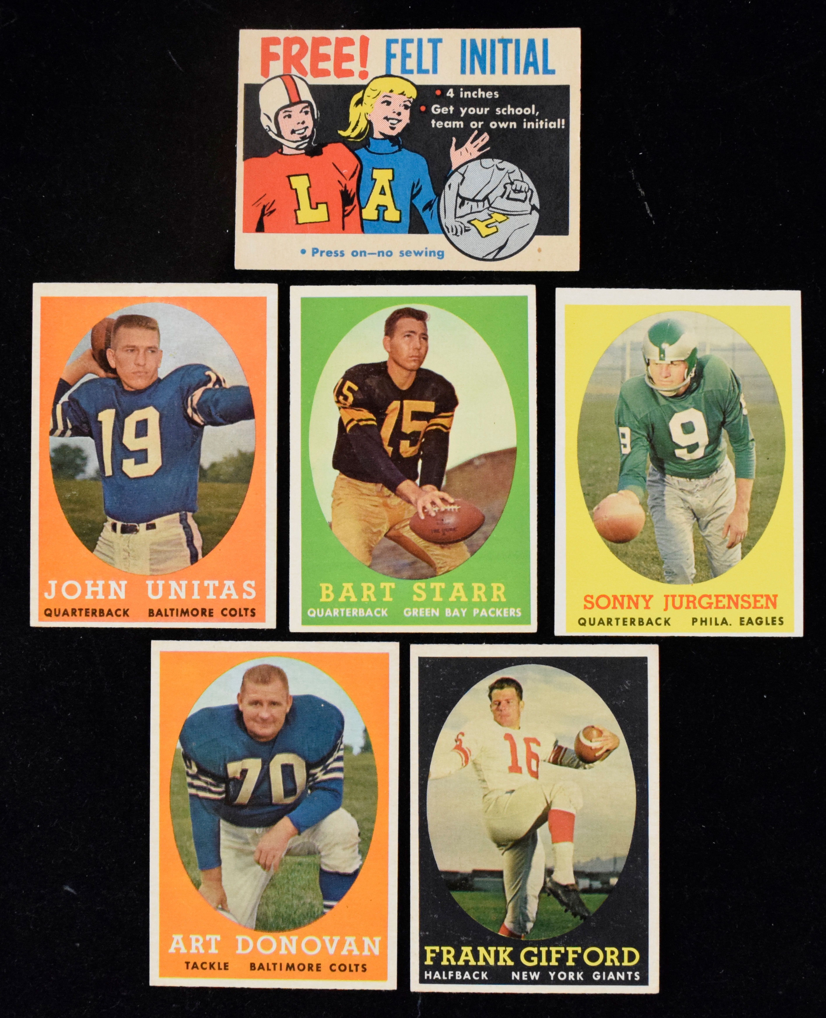 Description:Clean 1958 Topps Football partial set (101/132) with Unitas, Starr and Jurgensen RC (VG-NM). Very nice partial set offers (101) different cards out of the (132) issued, plus the unnumbered felt emblem insert for a total of 102 cards. Lot includes several notable stars and RCs, such as #s 2 Bobby Layne (EX OC), 10 Lenny Moore (EX), 22 Johnny Unitas (EX/MT OC), 35 Chuck Bednarik (EX), 52 Lou Groza (EX/MT), 66 Bart Starr (EX/MT), 73 Frank Gifford (EX), 90 Sonny Jurgensen RC (NM OC), 106 Art Donovan (NM), 120 Raymond Berry (EX; print defect), felt emblem insert (EX) and more. Balance of the lot appears mostly EX-EX/MT with a good portion in higher grades. Range: VG-NM.